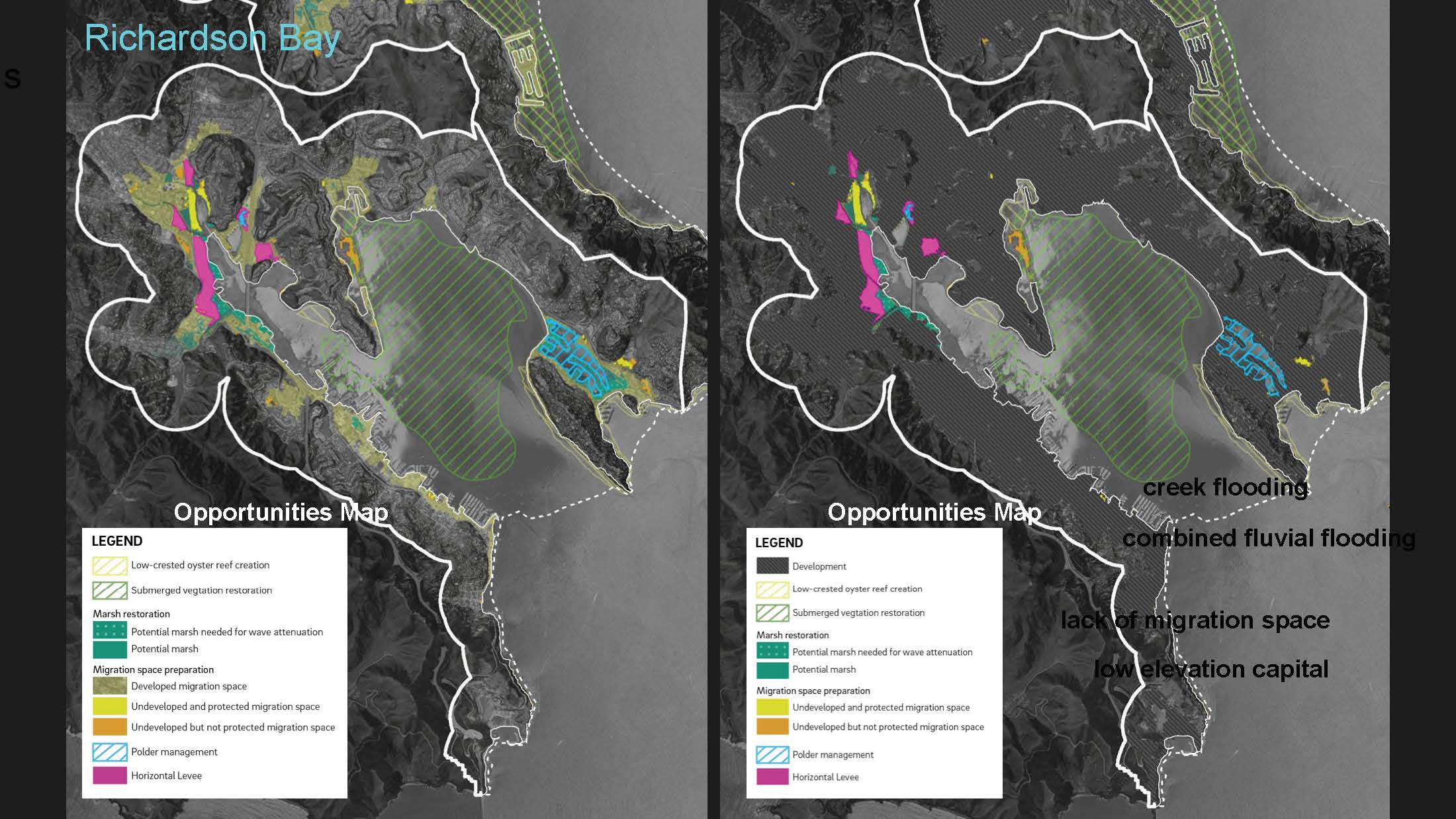 Dr. Grenier presented a map of the bay showing where it was appropriate to place each of these different solutions. “This is to try to give very specific advice to these decision makers,” she said. “For example, the tidal marsh map, there’s a version that says, how wide does your tidal marsh need to be to attenuate waves to protect whatever is behind it, and so we’re trying to both marry that tidal marsh restoration which has intrinsic ecological benefits with the ecosystem services that the tidal marsh provides. Then we put this all together with a vulnerability assessment that the city or the county may have done, and to understand what are the problems in each particular area and use that to create an opportunity map.”