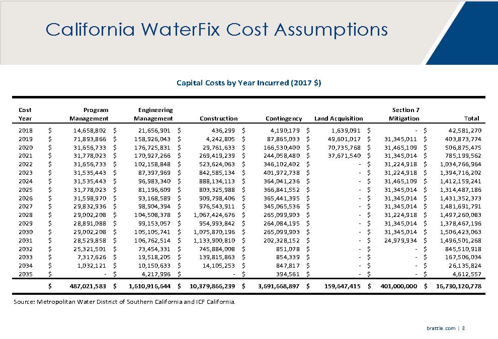 Dr. Sunding presented a slide with a spreadsheet of numbers, explaining that this is the information he was given by DWR and other folks involved with the analysis. The spreadsheet shows the construction costs, management costs, land acquisition, a contingency, and Section 7 Mitigation for a total of $16.7 billion, in 2017 dollars.