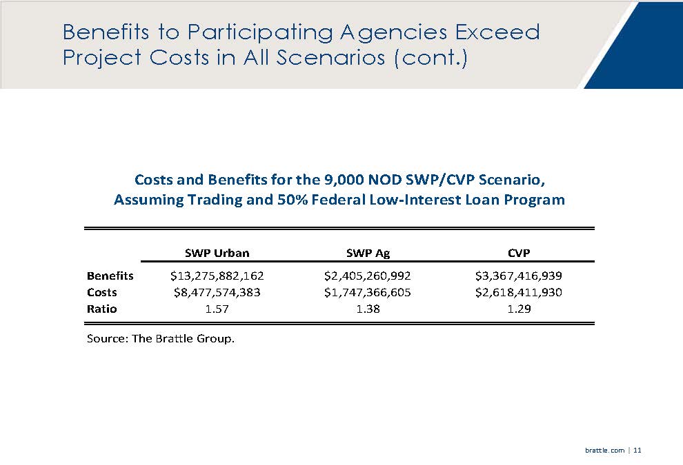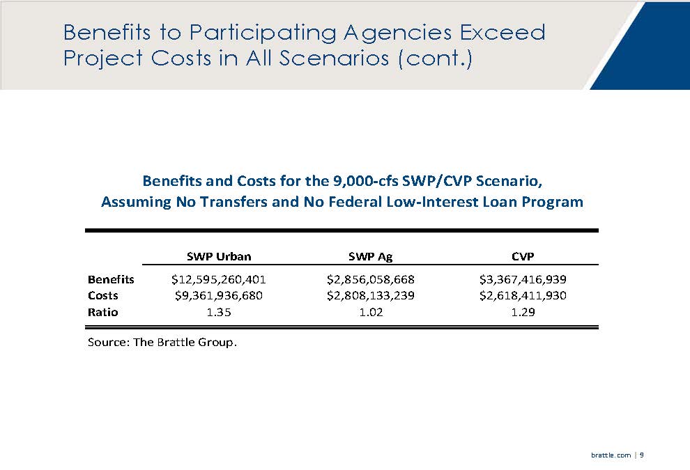 “This is an important result, because from what I understand, it’s uncertain if Central Valley Project contractors will participate,” he said. “It’s interesting to know that even if Central Valley Project participation doesn’t materialize, the benefits of the project to the State Water Project users are still an excess of costs.”