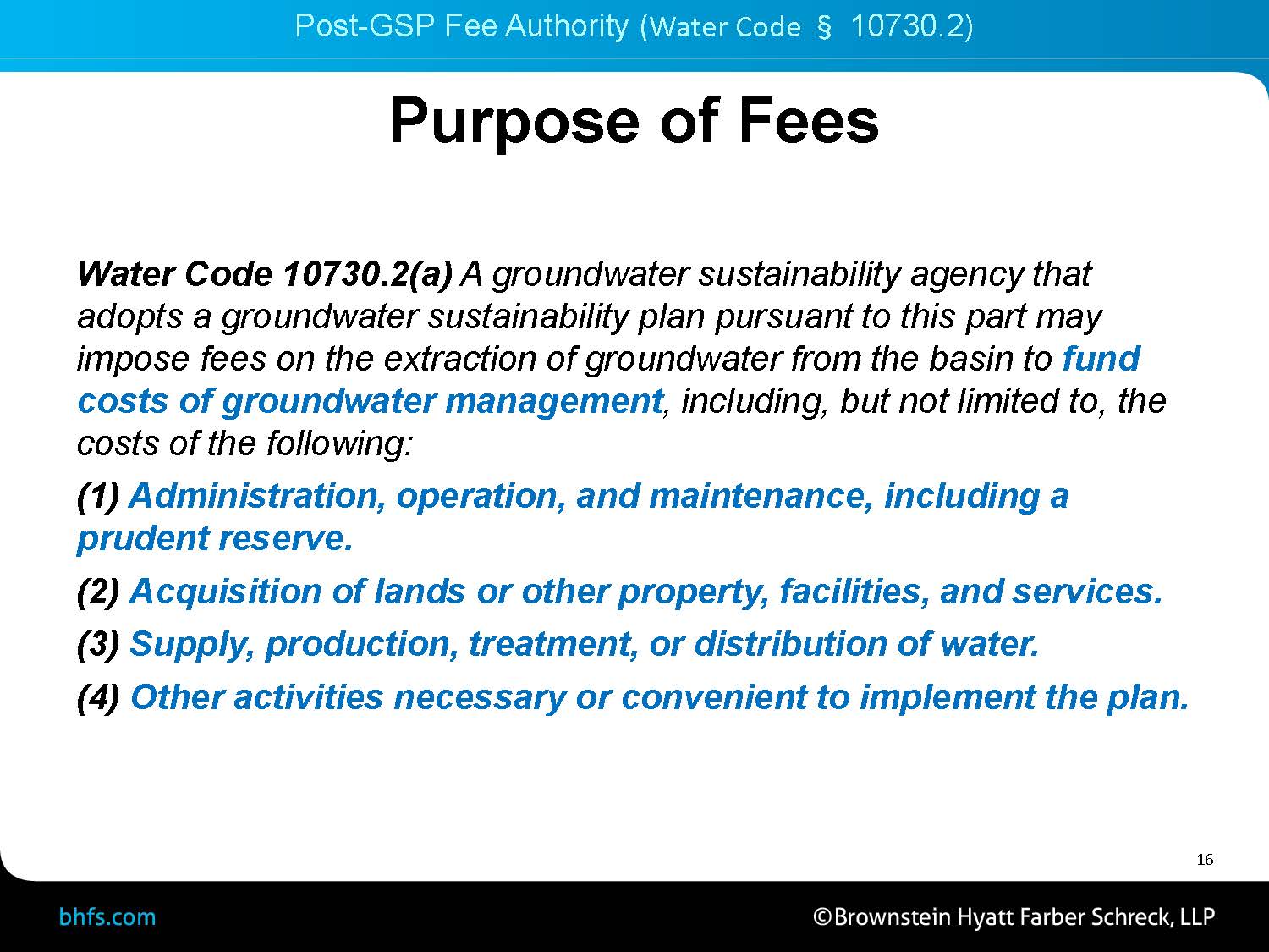 The post-GSP fee authority is governed by water code 10730.2 which authorizes a GSA to impose fees on the extraction of groundwater from the basin. “Here it is interesting to note that the legislation specifically identifies and calls out groundwater extractions as the only activity that a GSA can impose post-GSP fee on, and this is in contrast to SGMA’s broader pre-GSP fee authority, which also authorizes a GSA to impose fees on other regulated activities.”