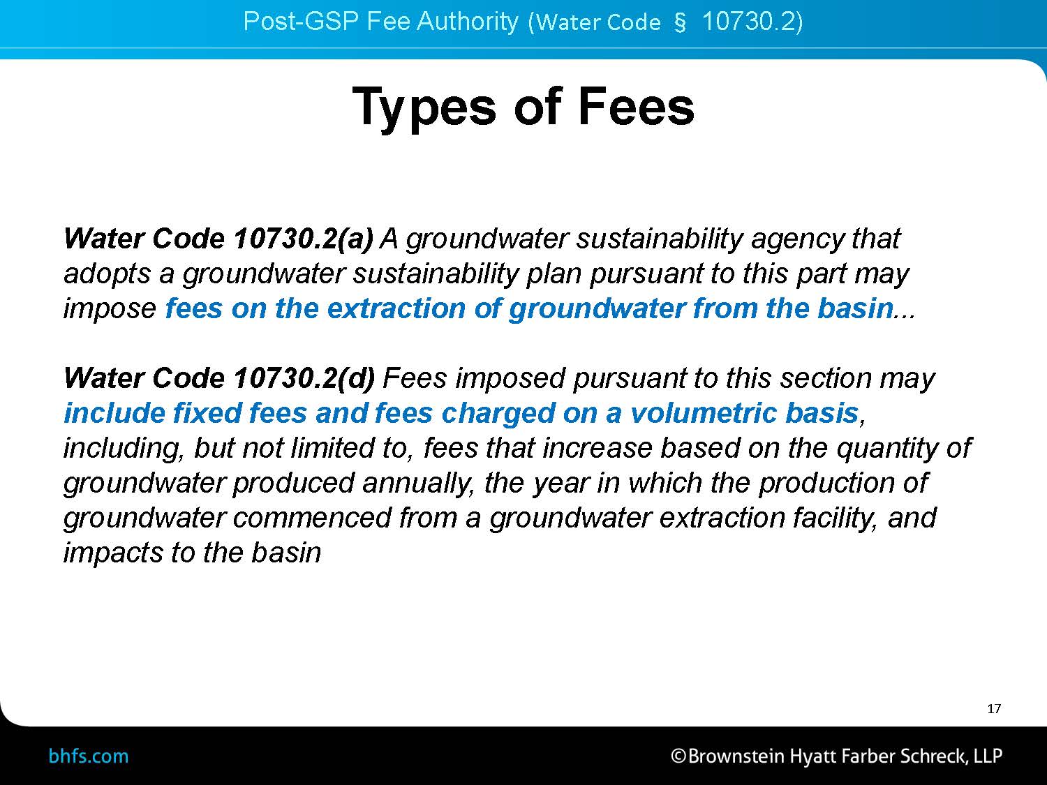 “This is one of the reasons that we recommend to clients to engage a fee consultant to help prepare the report and also to provide a third party independent stamp of approval on what fee is proposed to be imposed on all of the water users within the basin,” she said.