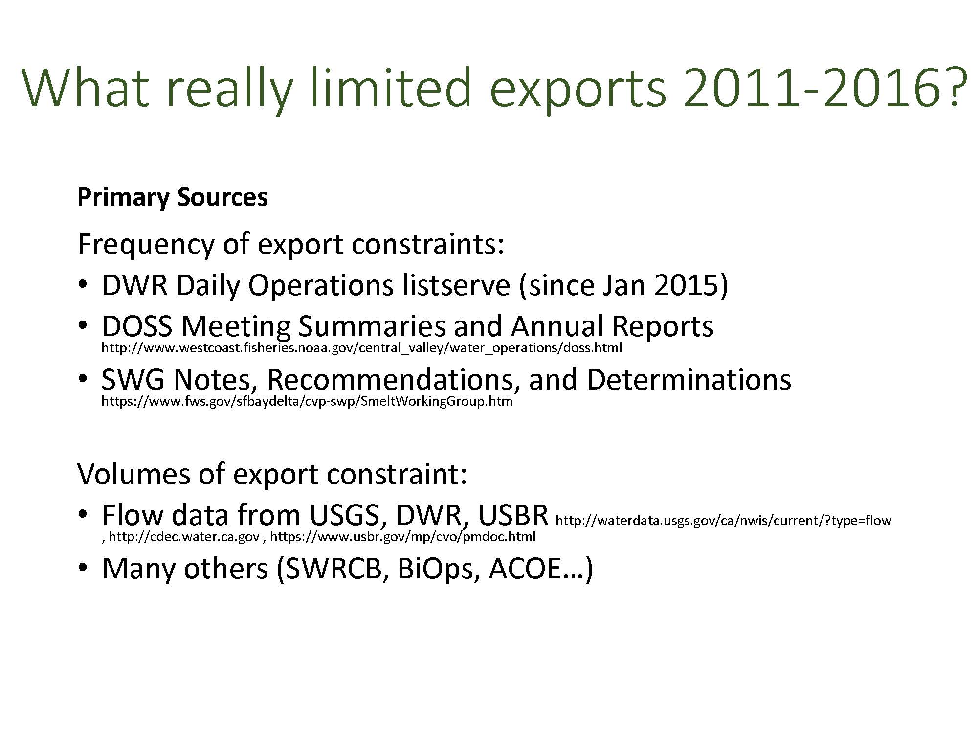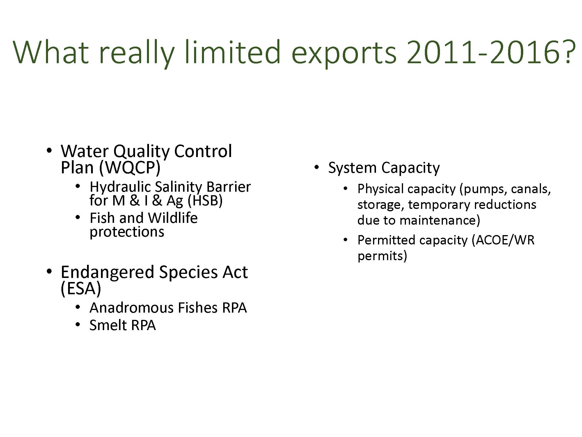 He noted that the various sources give various answers to what limited exports on any given day, so he had to interpolate for the days that were missing and figure it out from flows and regulations. The result was a daily analysis from 2011 to 2016, with the major categories of constraints being the Water Quality Control Plan, the Endangered Species Act, and system capacity.