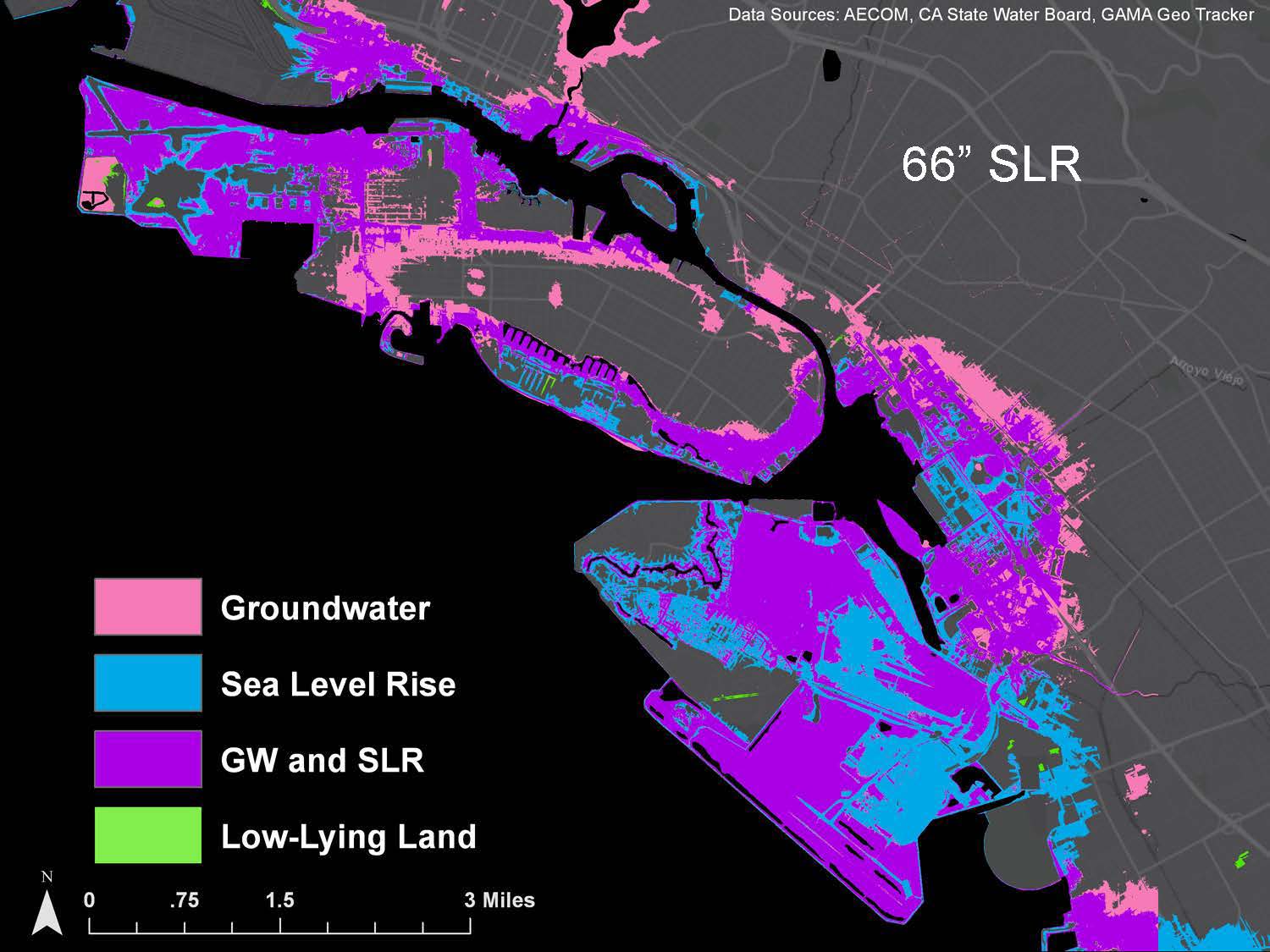 “In the East Oakland area, there’s a really vulnerable neighborhood if we consider groundwater inundation,” she said. “It’s not directly connected to the bay, but when we think about groundwater coming up, there could be ponding in that area that’s happening from groundwater emergence alone. So this is how we are starting to think about identifying some additional areas that should be targeted for adaptation planning efforts.”