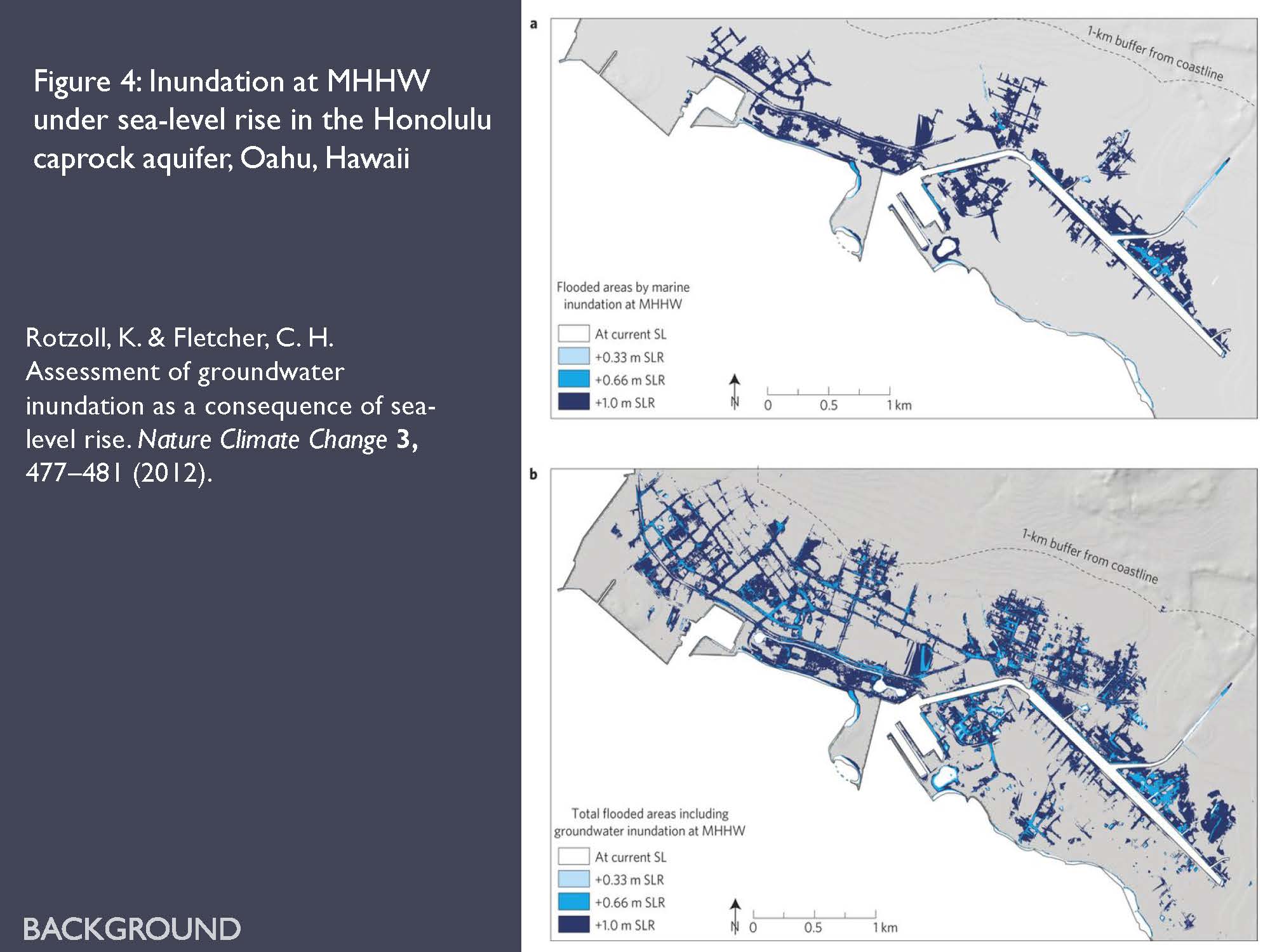 She next presented an image (bottom, left) from a 2012 Rotzell & Fletcher paper from 2012; the top figure is how much flooding is expected from direct inundation; the bottom figure shows the extent of flooding that could be expected in Honolulu when the additional factor of groundwater rise is accounted for.
