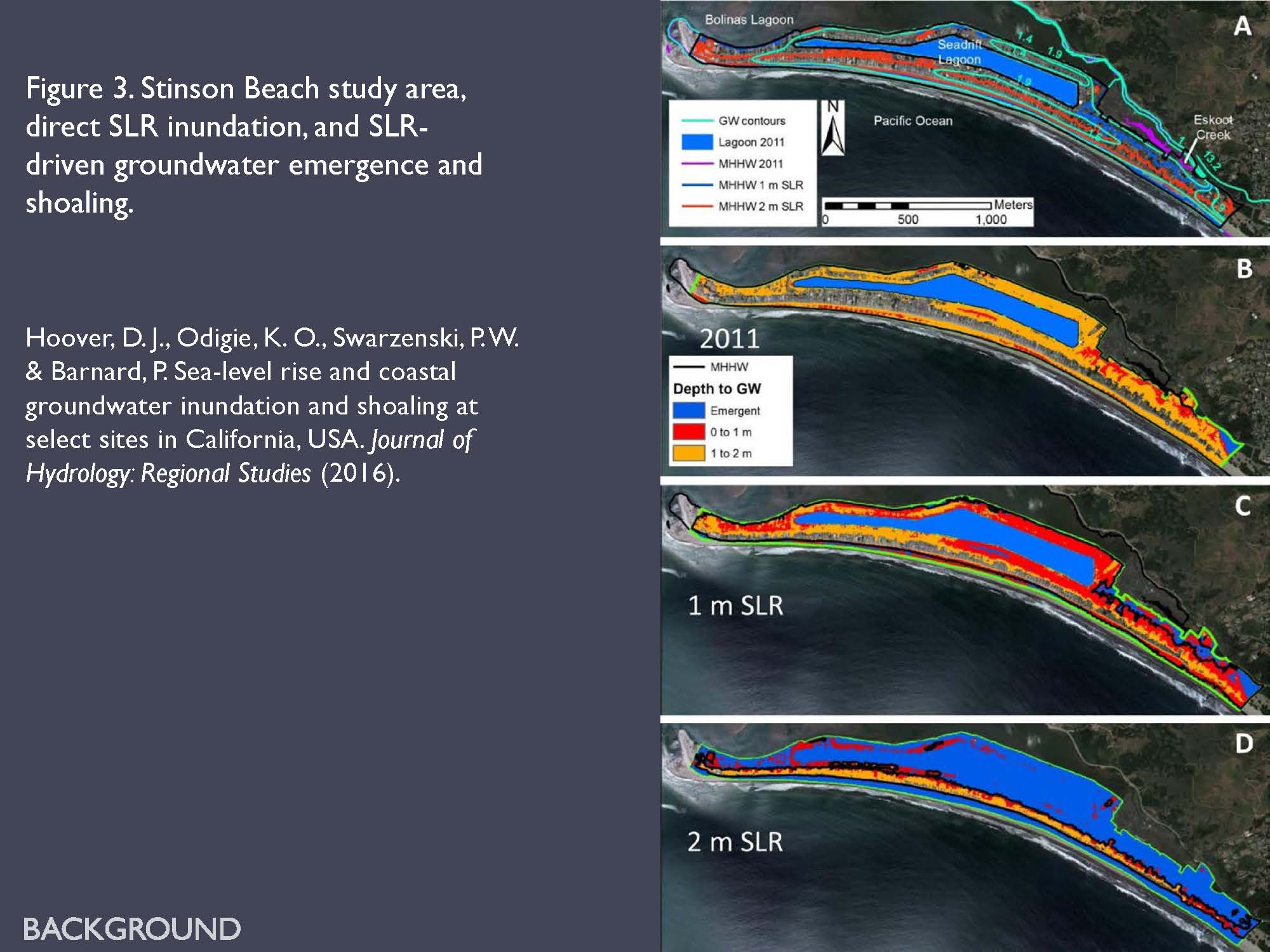Another important study is the Hoover et al paper (above, right) from 2016 where they applied a similar method at case study sites around California, including Stinson Beach; they explored using existing groundwater data to look at contours and then look at how much sea level rise would impact not only direct inundation, but inundation due to a rising groundwater table. So based those papers, they decided to look into how shallow groundwater would be affected in San Francisco Bay area.