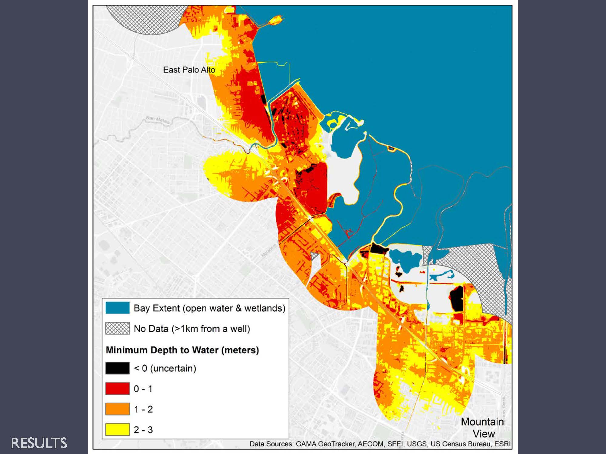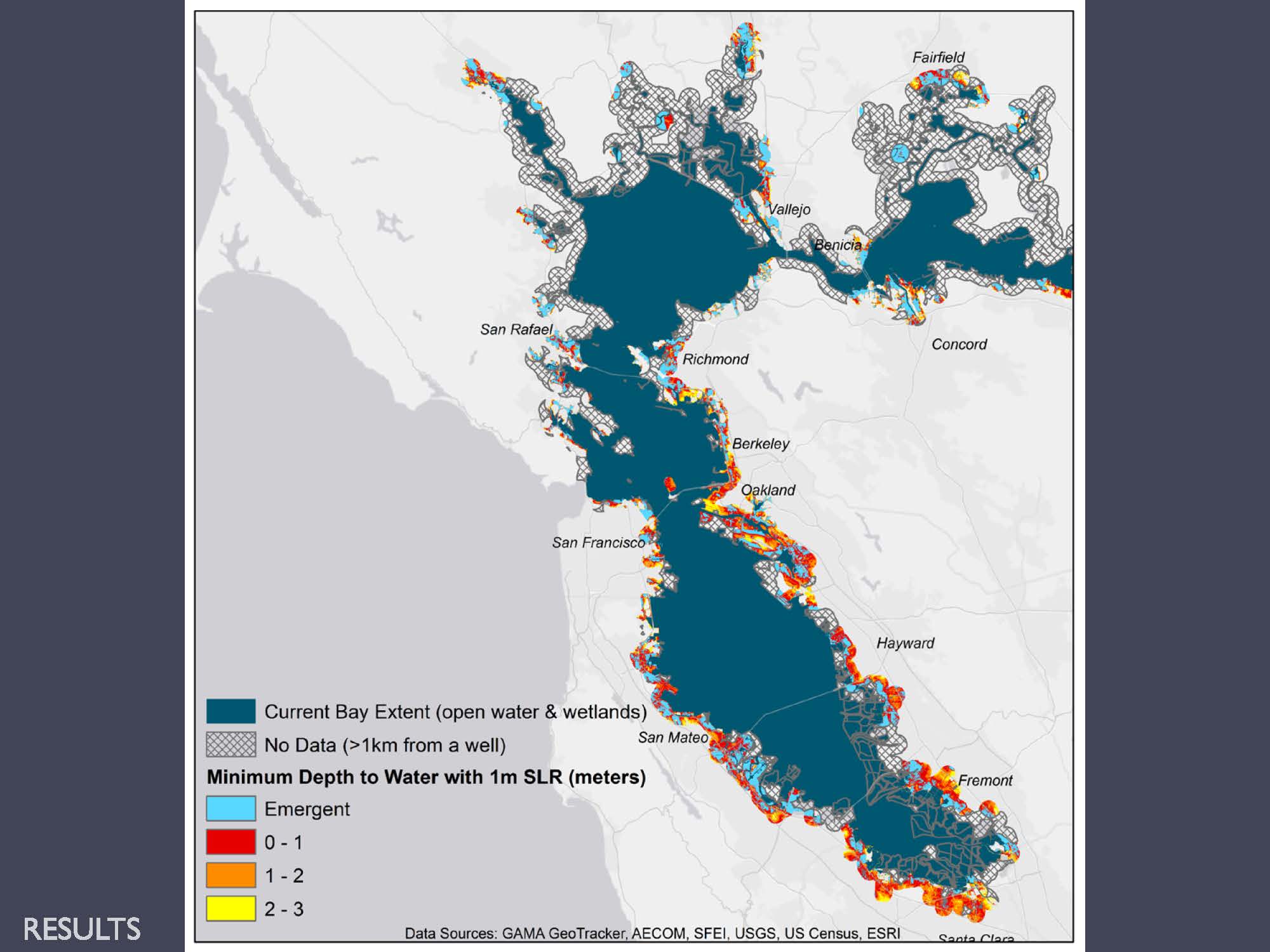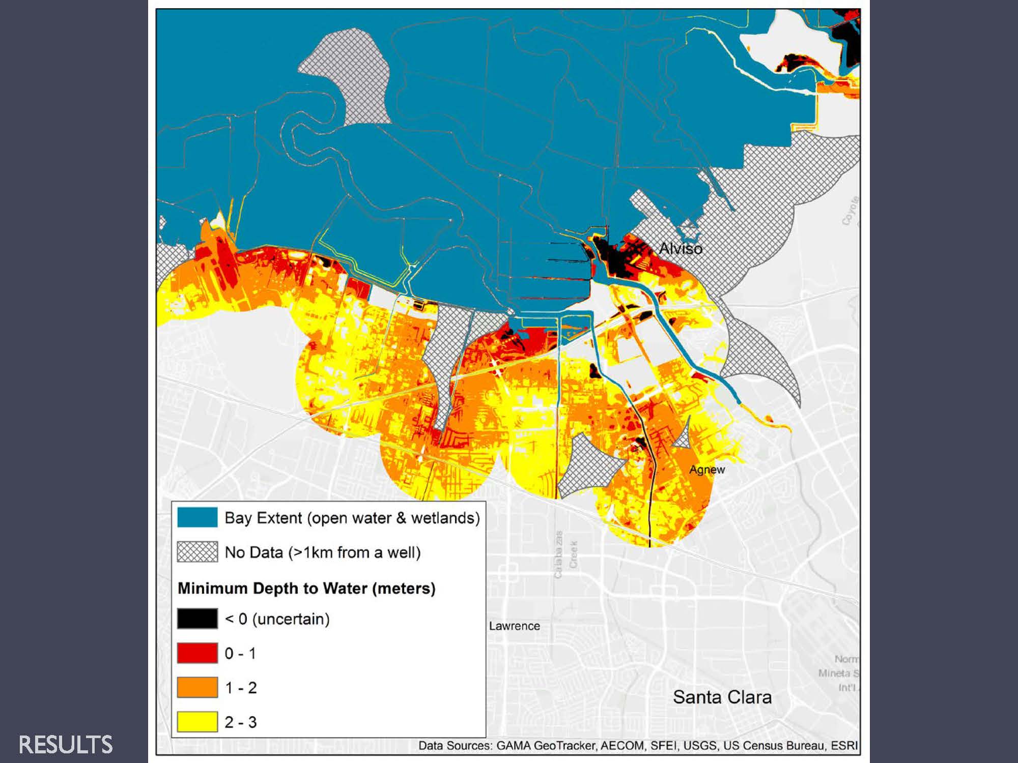 They used the data to determine the minimum depth to water value and the highest water table level between the years 1996 to 2016 and then used that data together with digital elevation model from the USGS to put together a basic interpolation model that looks at where the groundwater table is in wet years. The first pass of the data was made available on the UC Berkeley data sharing site in 2017 and was used in a paper by Hummel et al published earlier this year that considered the vulnerability of wastewater treatment plants around the Bay Area.