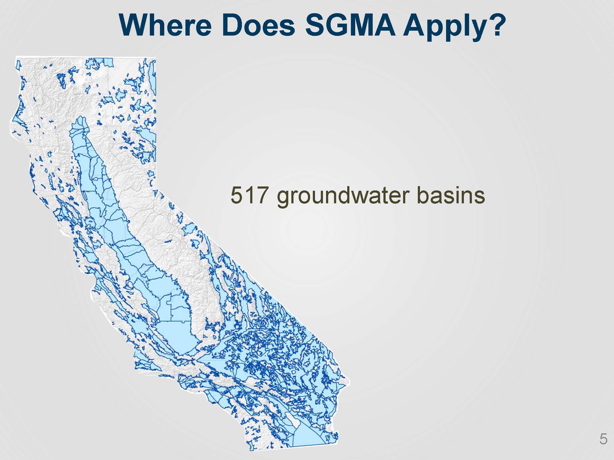 As of 2016, there are 517 groundwater basins in the state of California. SGMA applies to all basins that have been identified as high or medium priority by the Department of Water Resources. The initial basin prioritization in 2014 identified 127 high and medium groundwater basins. Of those, 21 basins were identified as critically overdrafted, the majority located in the Central Valley.