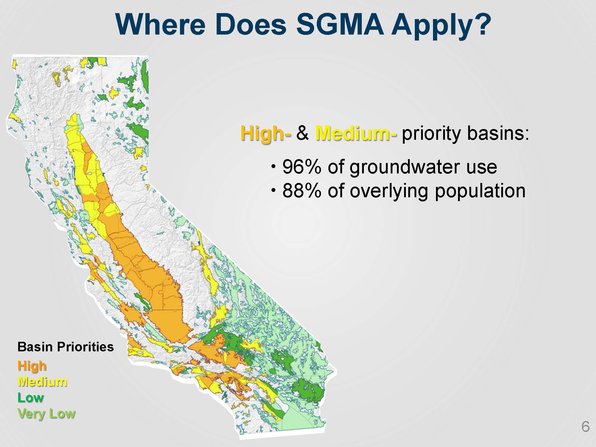 The basin prioritization process actually preceded SGMA; the prioritization occurred as a part of the legislation that established the California Groundwater Statewide Elevation Monitoring Network or CASGEM, which was a program focused on monitoring groundwater levels. SGMA legislation began with that initial prioritization. The basin prioritization is important because those basins designated as high and medium priority are required to form a GSA and do a GSP. Those basins designated as low and very-low are encouraged to develop GSPs, but it’s not required.