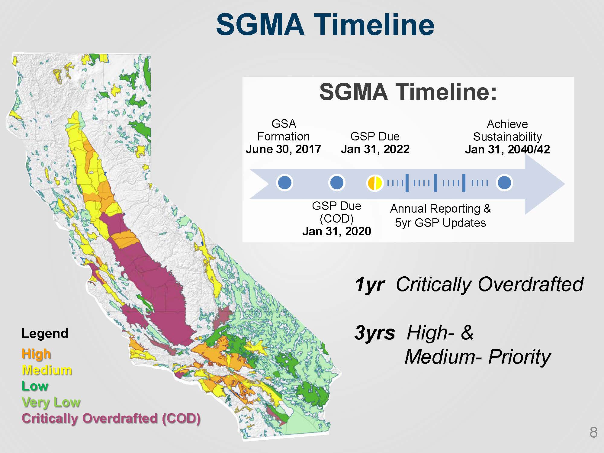 Critically overdrafted basins must be managed by a GSP by January 31, 2020; all other high and medium priority basins must have their GSP in place by January 31, 2022.