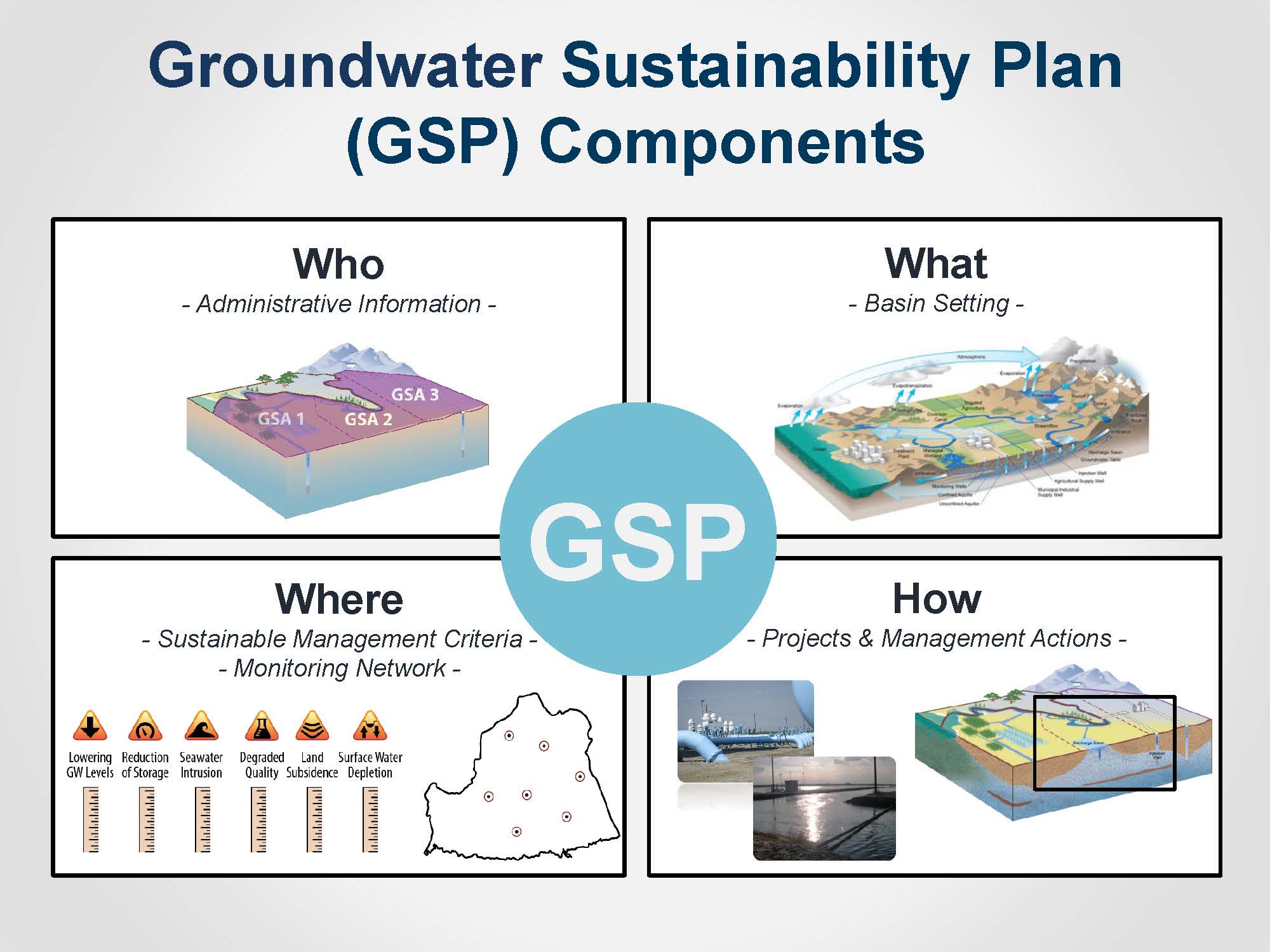 The GSPs will outline how sustainability in the basin will be achieved. SGMA defines sustainability in terms of avoiding six undesirable results: chronic lowering of groundwater levels, reduction of groundwater storage, seawater intrusion, degraded water quality, land subsidence, and surface water depletion.