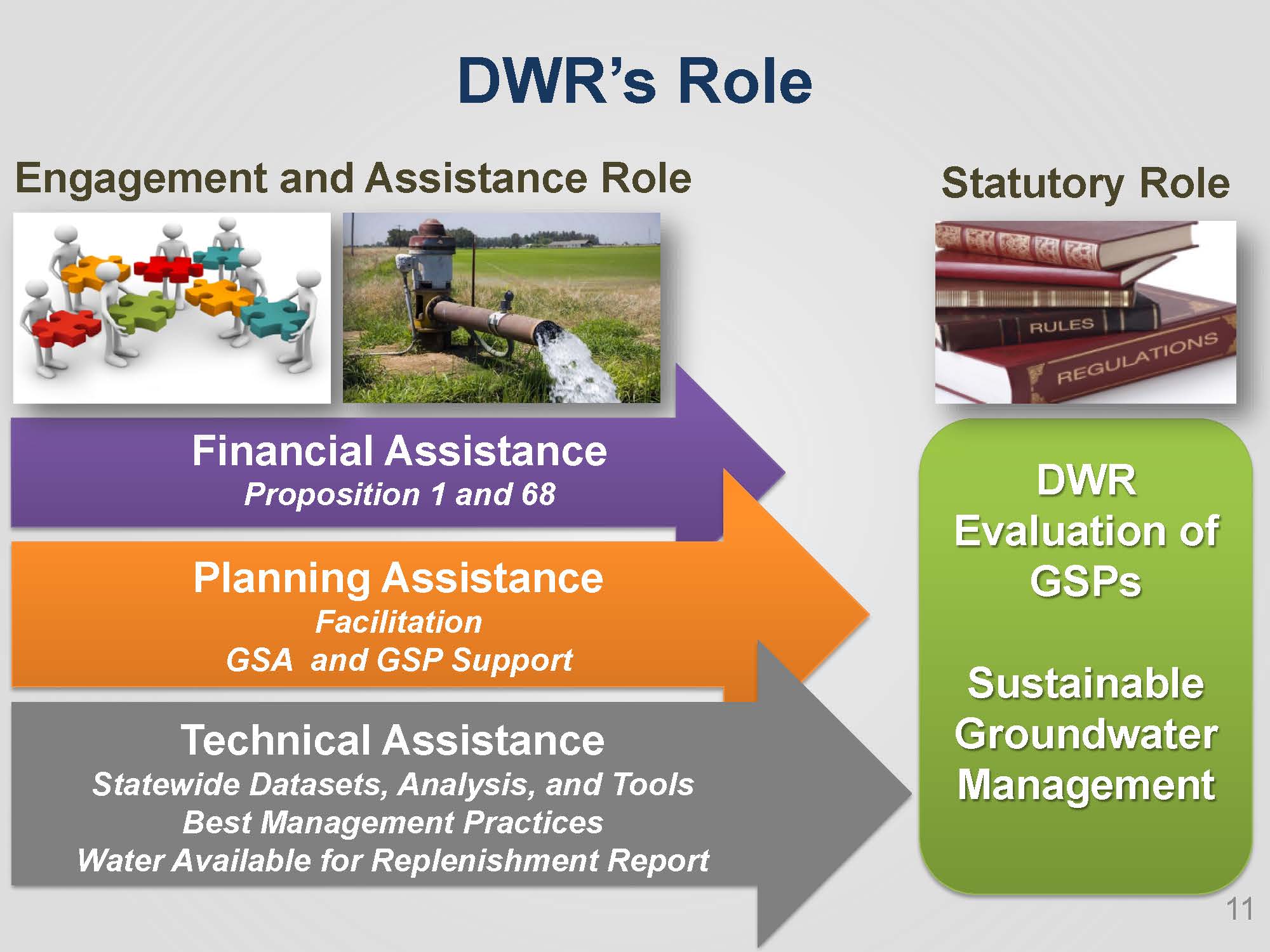 The Department traditionally has provided financial, planning, and technical assistance. SGMA defined a new regulatory role for the Department, requiring them to evaluate the Groundwater Sustainability Plans as well as the alternatives that have been provided.
