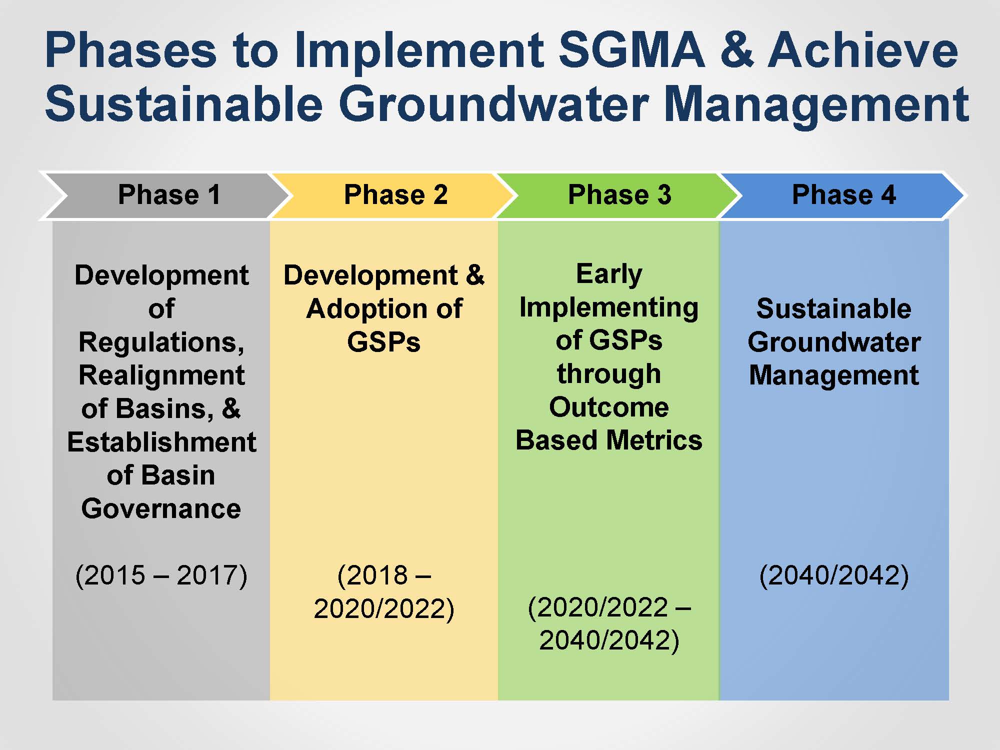 There are several phases to SGMA implementation. The first phase was the development of regulations, the realignment of basin boundaries, and the establishment of basin governance through the formation of Groundwater Sustainability Agencies. Phase 2 is the development and adoption of the Groundwater Sustainability Plans, which has been ongoing since 2017. Phase 3 will be the implementation of GSPs, along with the annual reports and the outcome-based metrics and how those are applying to the basins. Phase 4 is when the GSAs reach their sustainability goals at 2040 or 2042.