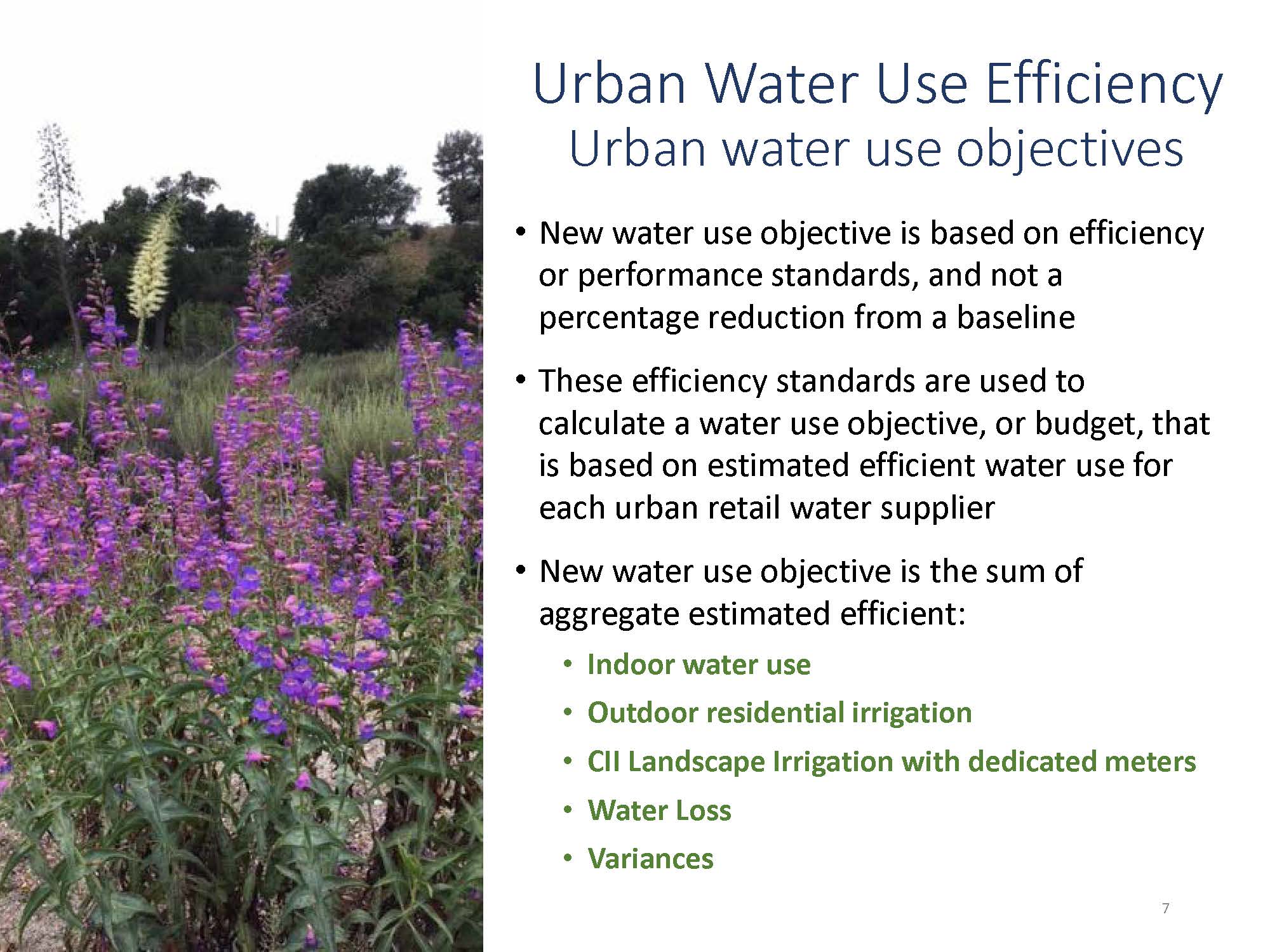 The legislation does not change the existing water conservation targets that were set under the SBX 7-7, which is a 20% reduction in per capita water use by 2020; meeting those targets is still required. Rather, the new legislation sets new water use objectives based on efficiency standards that exceed the conservation required by 20×2020 target and includes provisions for commercial, industrial, and institutional performance measures. The legislation also requires more robust water shortage contingency planning and drought risk assessments, as well as drought planning for small systems in rural communities. There are also enhanced requirements for agricultural water management planning.