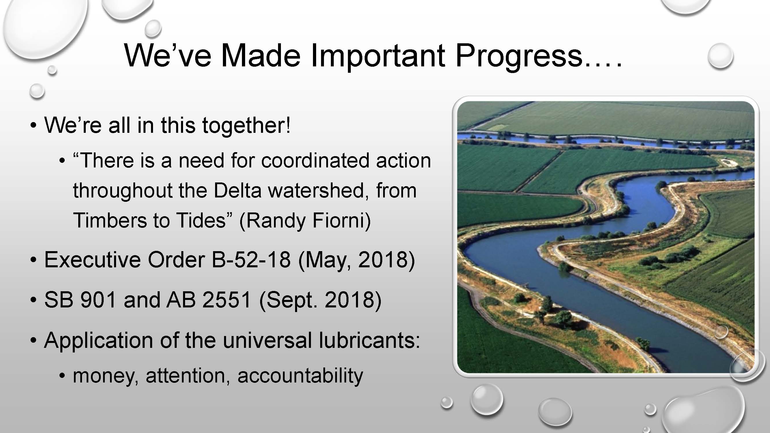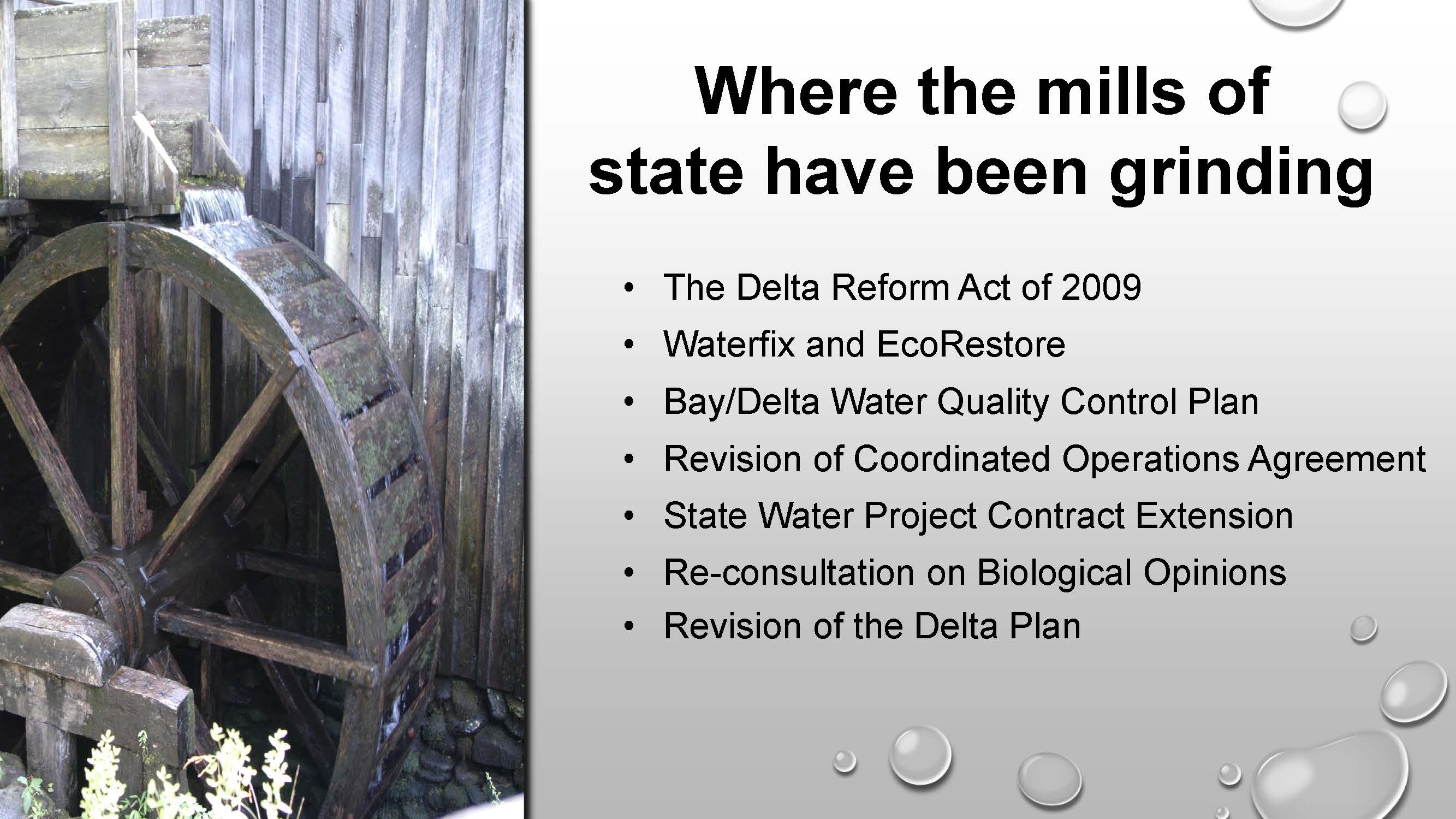 He presented a slide with a quote, noting that the significance of the quote is that processes that get started may be move slowly but come to conclusions, and some conclusions are close with respect to what’s going to happen in the Delta.