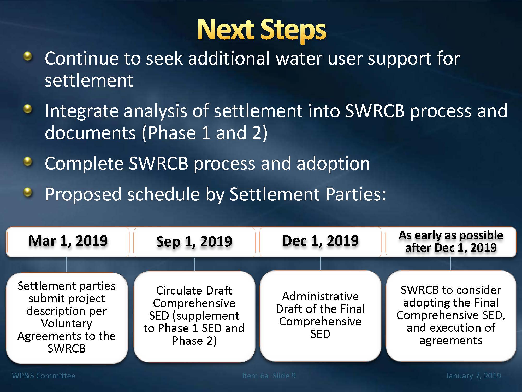 The State Water Board decided to move forward with their proposed action at their December 12 meeting, mainly because they are looking for more complete development of the settlement, particularly on the San Joaquin River because that was the scope of the amendment they were considering, Mr. Arakawa said. The next steps, based on their discussion on September 12, was to continue getting that additional commitment for moving forward with the settlement, and also to make sure that the analysis of the settlement is included in the State Water Board process so that the Board has the means of evaluating this alternative versus the other alternatives they’ve been looking at that. Then they would move forward with the process to complete their decision and to adopt an overall water quality control plan.