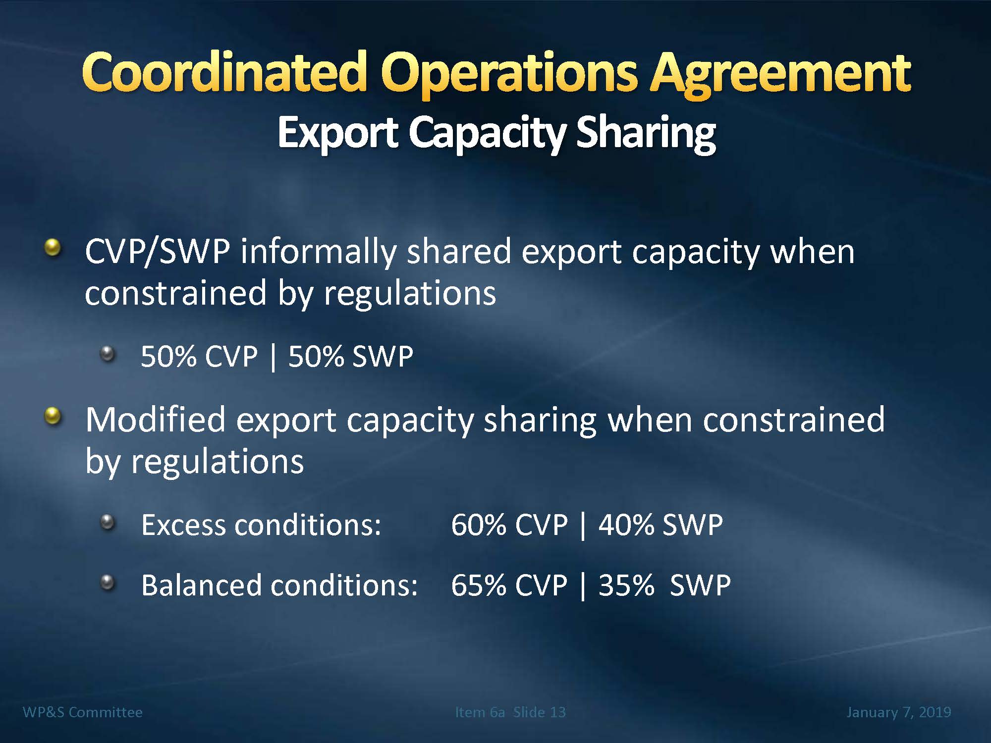 In 1986, the Coordinated Operations Agreement (COA) was signed and has been in place ever since. The Coordinated Operations Agreement defines the sharing of the water supply, how reservoir releases from upstream reservoirs are meeting in-basin and upstream water right holders’ needs, the water quality standards in the Delta, and how much water can be exported. Since the time the agreement was signed, he noted that a lot of things have changed, such as regulations, additional facilities, and more importantly, the exports constraints that are in place today.