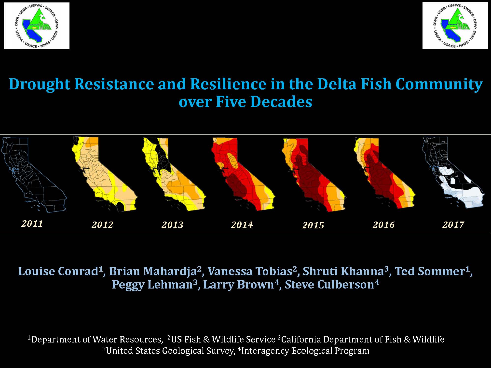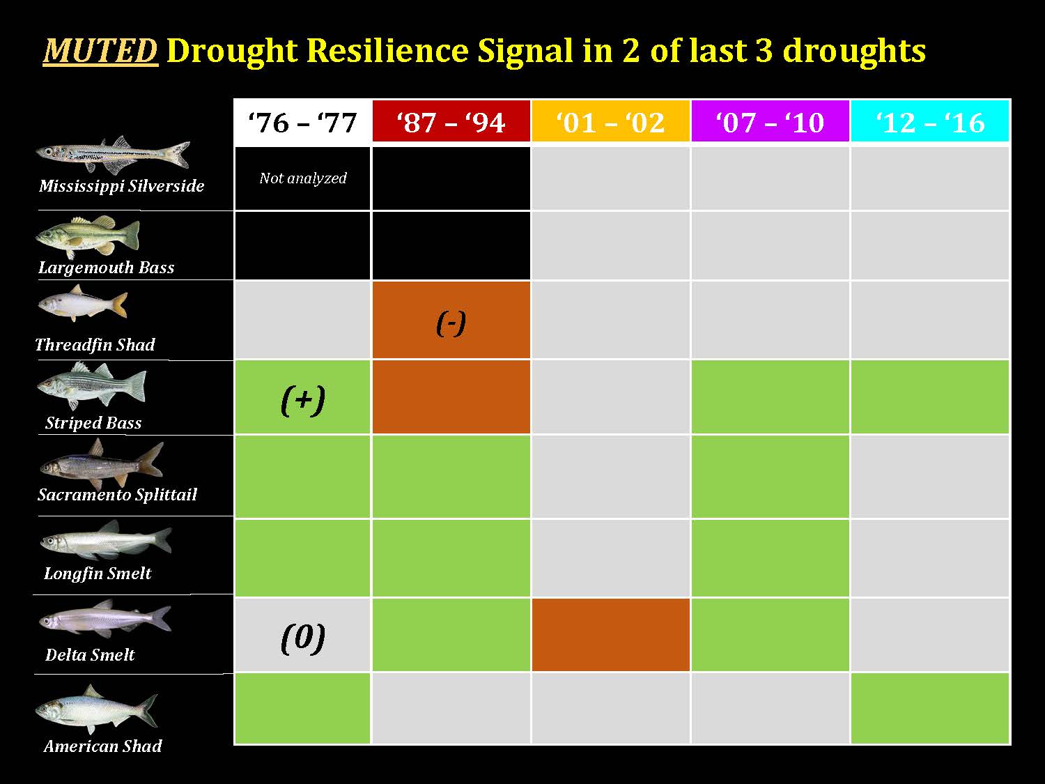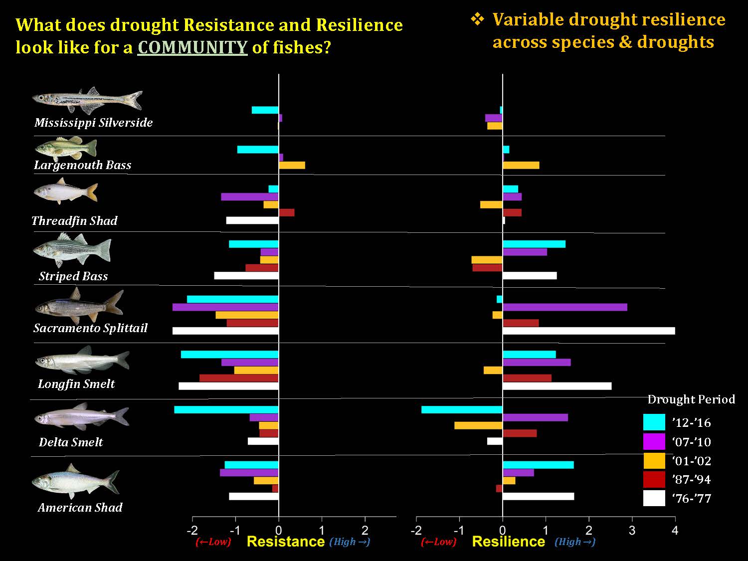 There are a numerous ways to look at this. A lot of different data is collected on all sorts of different parameters in the system, so for this analysis, they chose to look at fish communities, including the smelts, some non-native fishes, and non-listed native fishes such as the Sacramento sucker. They wanted to know how the capacity for drought resilience has changed over recent decades for the fish communities.