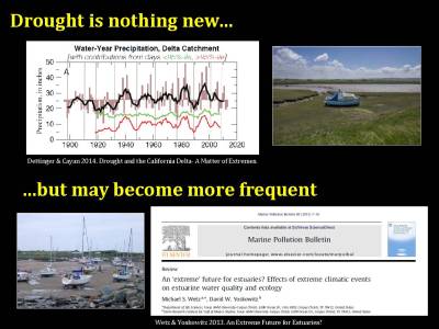 The IEP has looked at what happens during drought. Dr. Conrad presented a slide from a previous IEP synthesis effort that used multiple datasets to look at how water quality and biological communities changed during drought over the last ten or fifteen years.