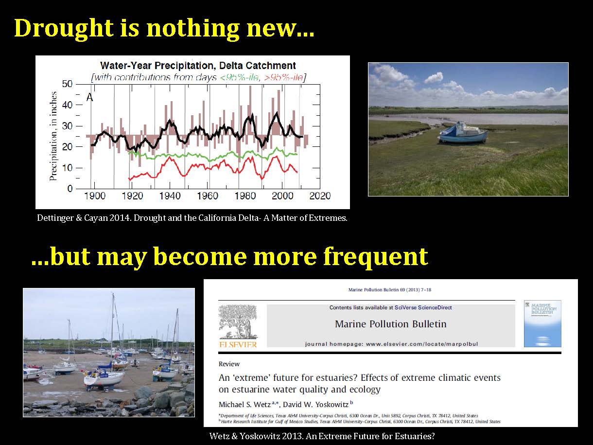 “The paper from Michael Wetts at Texas A&M notes that we don’t know a lot about how estuaries in particular respond to extreme climatic events like drought, and with the fact that they may become more frequent, we would do well to understand what we can expect for how estuaries are going to persist through drought or how they will respond to it,” she said. “Then maybe more importantly, how will they recover? If they are going to become more frequent then that recovery phase is pretty critical. And as managers, we need to manage our own expectations from what we can expect from a wet year after a year of drought.”