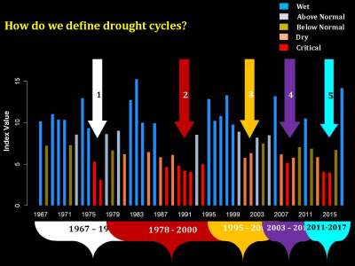 “So we can define these five drought cycles where the post-drought period for one drought becomes the pre-drought period for the next one,” said Dr. Conrad. “But you’ll notice in this time series here, we had to do a lot of lumping. For example, 1985 was a dry year but it was just one year surrounded by wet years, so how does defining the drought like this work? Was there a lot of variation within our wet periods that make them so distinct from the dry periods?”