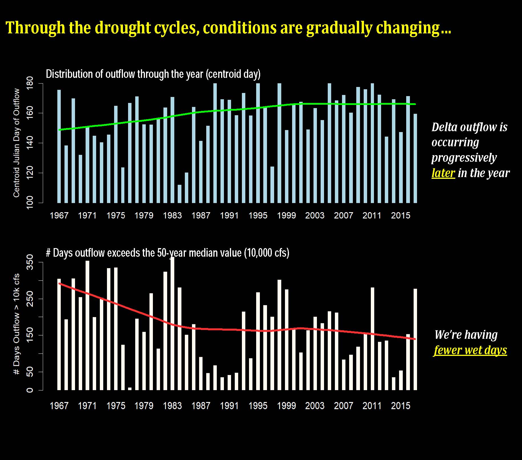 “It’s very gradual; the first graph on the top shows you the distribution of Delta outflow through the year using the centroid of outflow to describe the timing of when it happens, and that progressively, it’s very gradual and subtle, but it’s progressively happening later in the year,” said Dr. Conrad. “The bottom graph is showing you the number of days that outflow exceeded 10,000 cfs, which is the 50 year median value for the whole time series that we looked at. It looks like we’re less likely to have those days in the present day compared to the beginning of this time series.”
