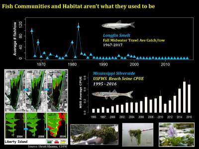“So at the same time, the habitat itself is changing,” she said. “We have an increasing prevalence and coverage of invasive aquatic vegetation which we think has some habitat effects. So how do we look at resilience, given this changing baseline? For example, it’s not fair to say that for longfin smelt responding to wet conditions after drought, we’re getting same conditions that we would if it were 1985. That wouldn’t be right.”