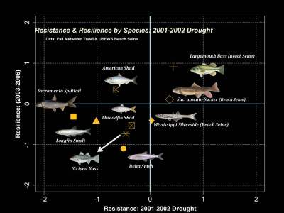“You’ll notice that largemouth bass are in that high resistance, high resilience quadrant where they are doing well through the whole drought cycle, maybe even growing,” she said. “The Delta smelt is down here in the not responding well to drought and not necessarily recovering afterwards.”