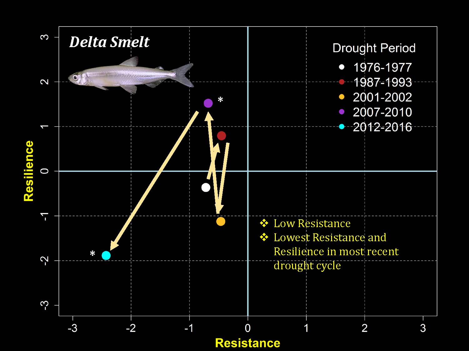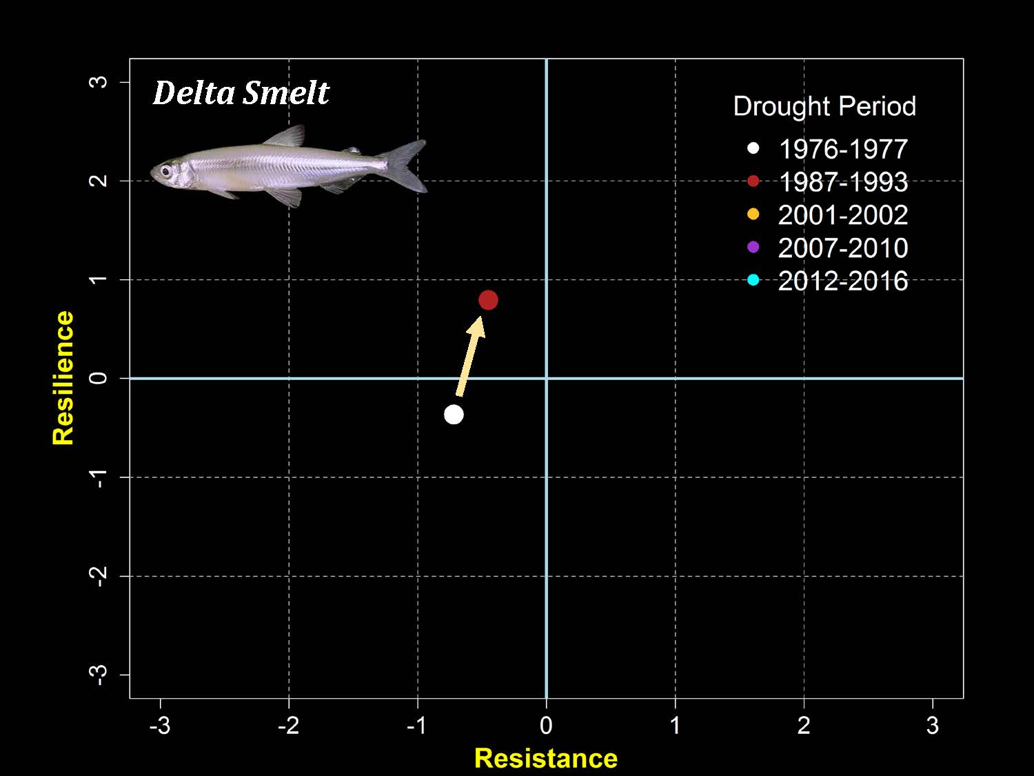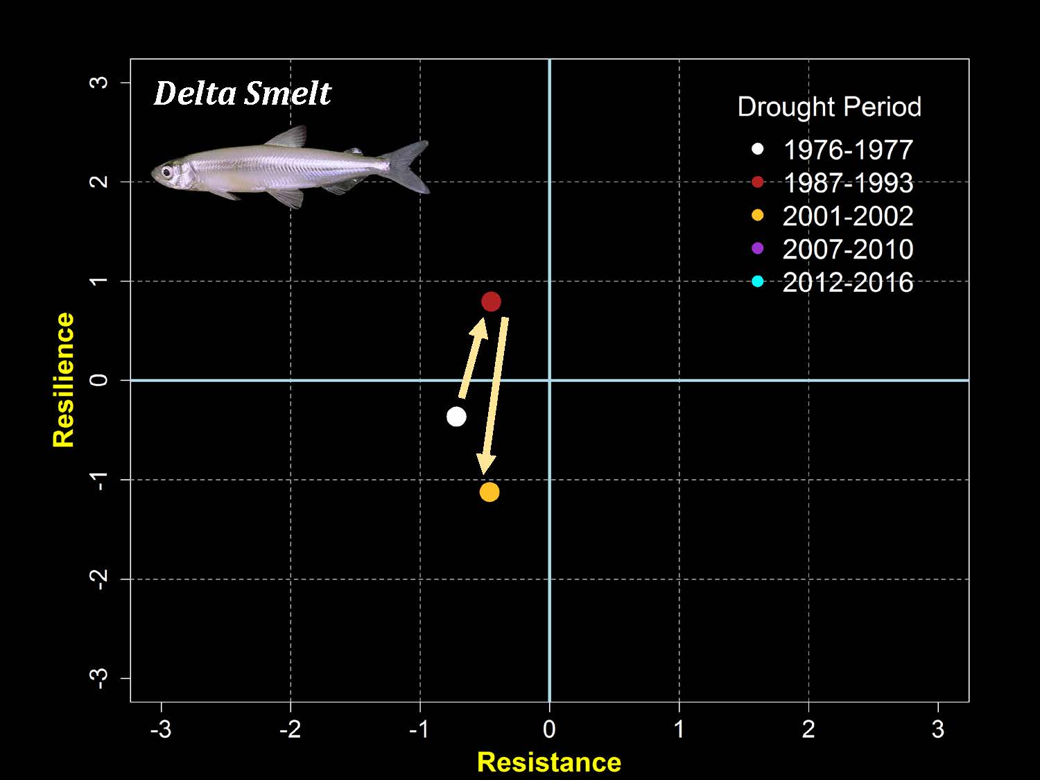 She noted that the recovery from the 1987 to 1993 drought was better than it had been after the 76-77 drought, then the next drought cycle, it was down in the quadrant of more population decline, back up in 2007 to 2010, but the recovery was one year; 2011 it was a colder year and they did well, so there is resilience there; and then with our most recent drought that occurred 2012 to 2016, the smelt are in the lower quadrant with the recovery or the resilience not favorable for the species.