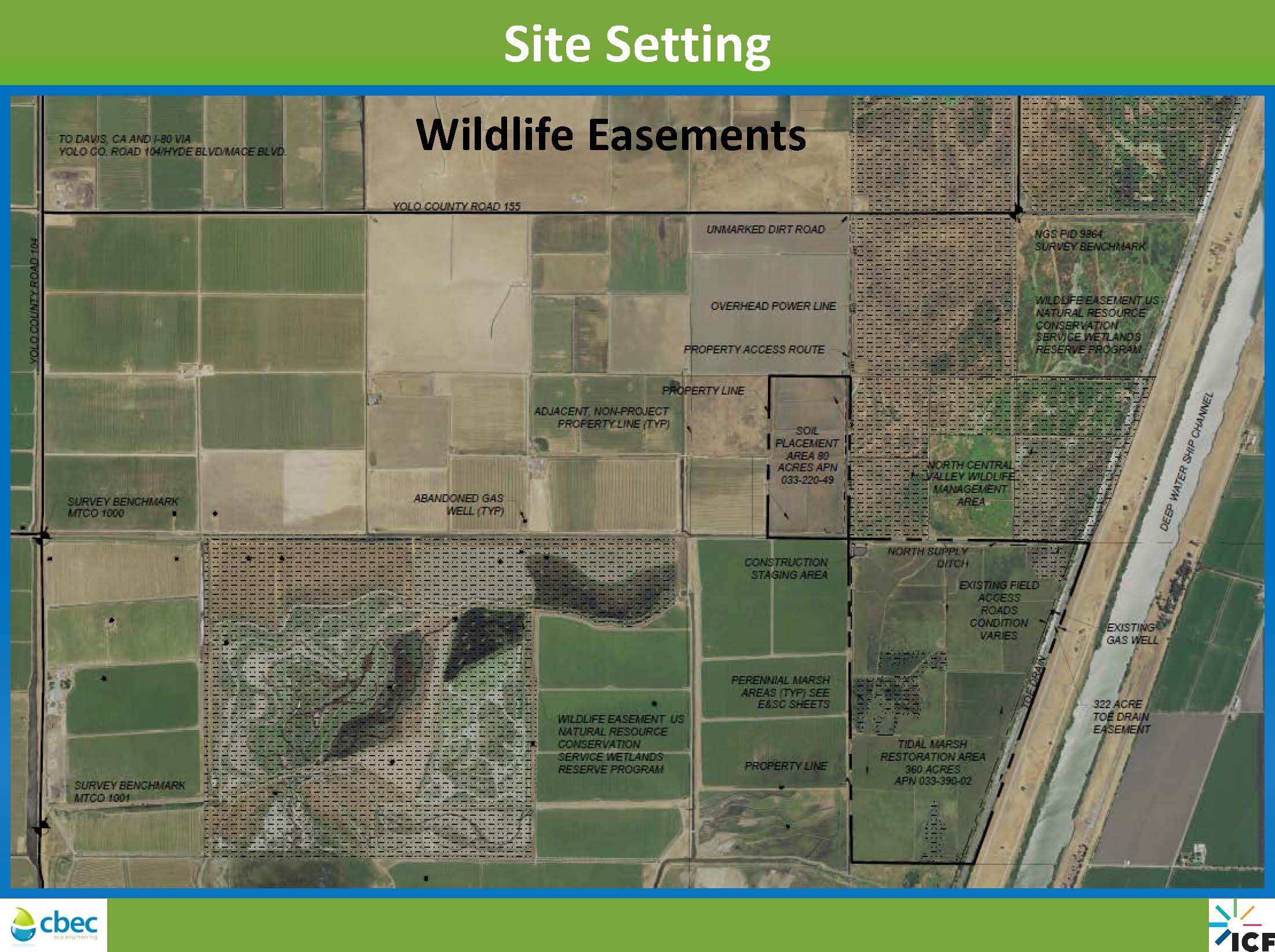 There are several wildlife easements in the vicinity of the project site, largely to support waterfowl (upper, right). Those are largely disconnected, they are not tidally connected to the toe drain, and are largely inundated only by the larger floods that are moving down the Yolo Bypass.