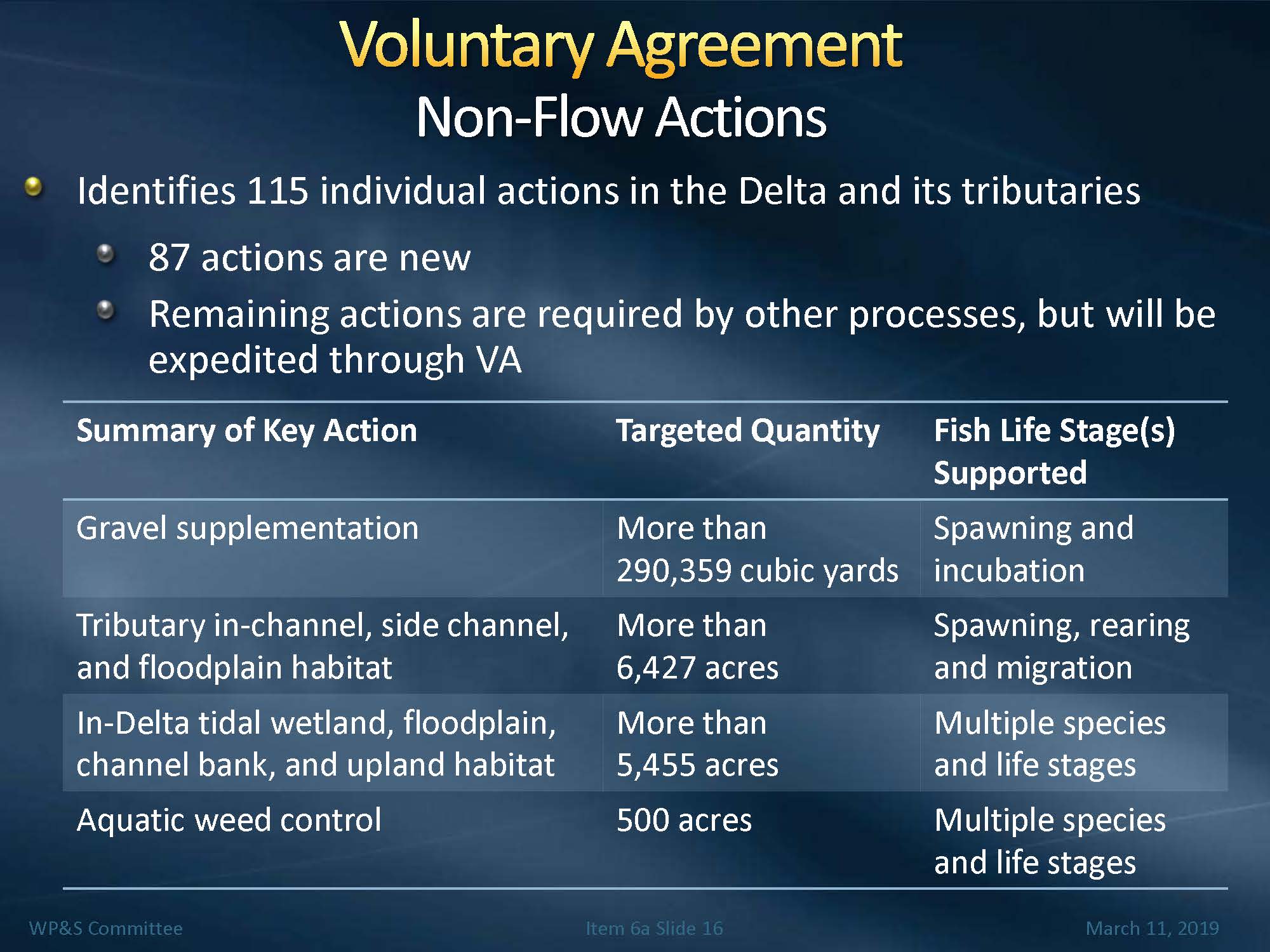 The Voluntary Agreement includes 115 individual actions, both in the Delta and in the tributaries upstream; 87 of the actions are new and 28 were existing actions that the state is looking to expedite or accelerate.