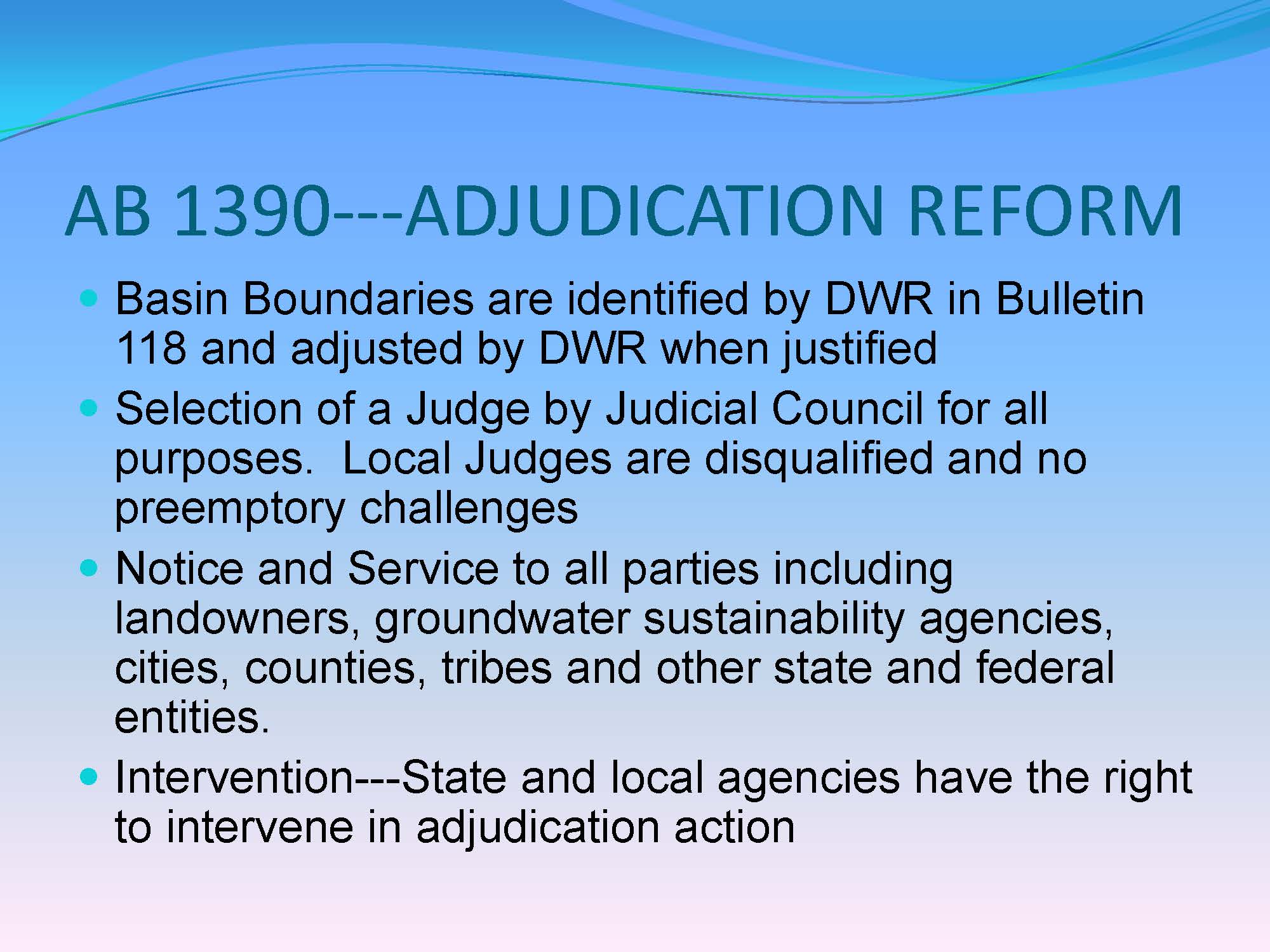 Ron Robie noted that SB 226 and AB 1390 that passed in 2015 changed some things to streamline adjudications and harmonize the process more with SGMA. Previous adjudications were under common law. The new legislation codified the rules for basin-wide adjudications; it amended the code of civil procedure, and also added a chapter on adjudications in SGMA.