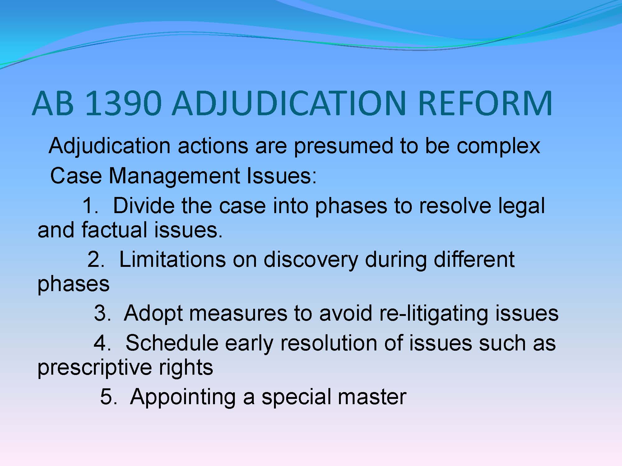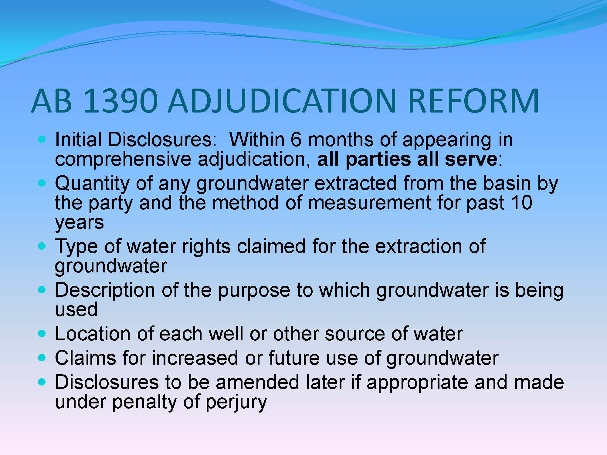 Other elements of the streamlining legislation include presumption that adjudications are complex so they will now automatically go to a judge that handles complex litigation; the court can divide the case into phases; there are limitations on discovery, and measures to prevent relitigating issues. It also requires the court to consider some matters in advance of other things, such as deciding prescriptive rights; it authorizes the appointment of a special master which is not under the present law, and it requires all parties all serve the quantity of groundwater extractions for past 10 years, type of water rights claimed, purpose to which groundwater is being used, and other data.