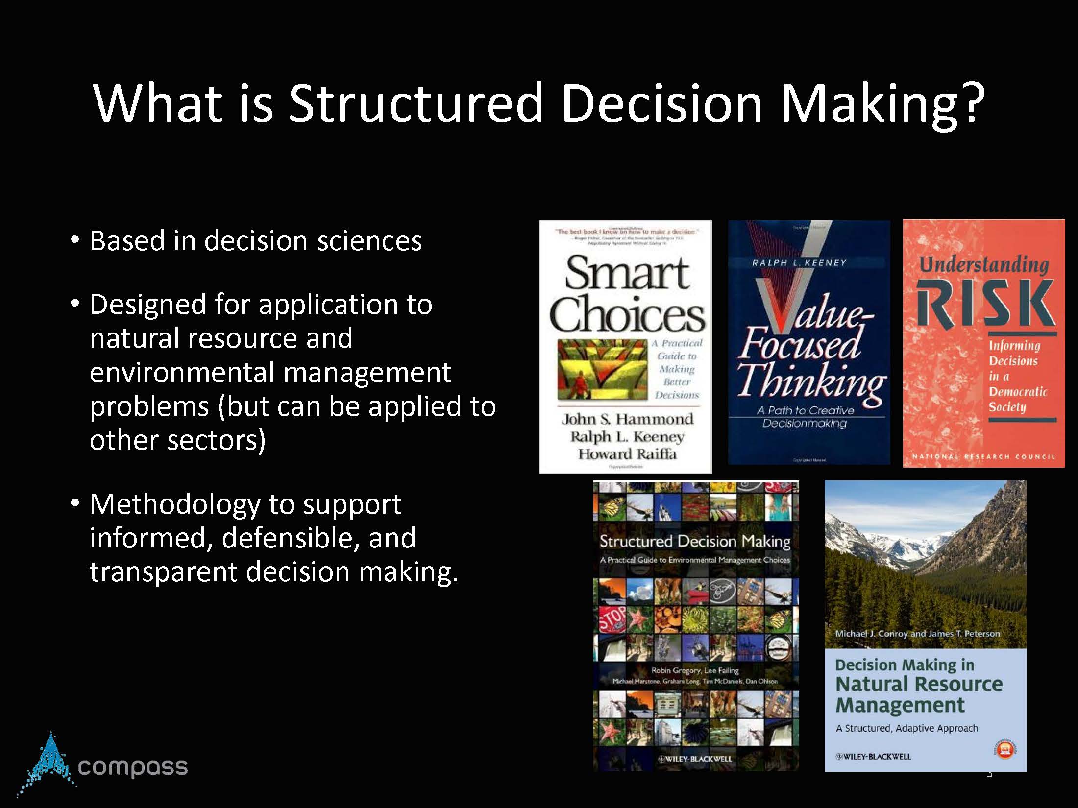 Structured decision was developed in the 1990s to apply the tools and theory from the decision sciences to environmental and resource management problems. As a methodology, it consists of processes, tools, and techniques to support making informed, defensible, and transparent decisions. Ms. Rudd noted that Compass defines a good decision as one that is informed by the best available knowledge, is defensible so that it can stand up to public and technical scrutiny, and is transparent in the sense that you can see exactly what the information is and the value based trade-offs that were considered within the decision process.
