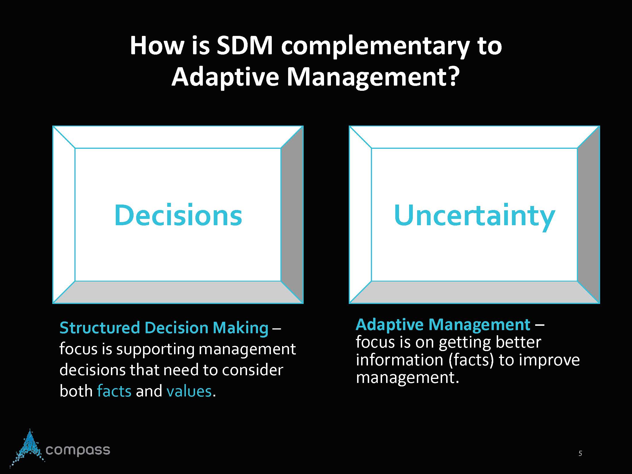 How is structured decision making complementary to adaptive management? In structured decision making, the focus is on decisions and in particular management decisions that need to consider both facts and values, so a decision needs to be value based in terms of considering what you care about and what’s important as well as science based, considering what you know and what you don’t know. However, adaptive management is focused on resolving uncertainties so that we can better understand how to effectively advance our management objectives, so adaptive management is more about getting more facts, she said.