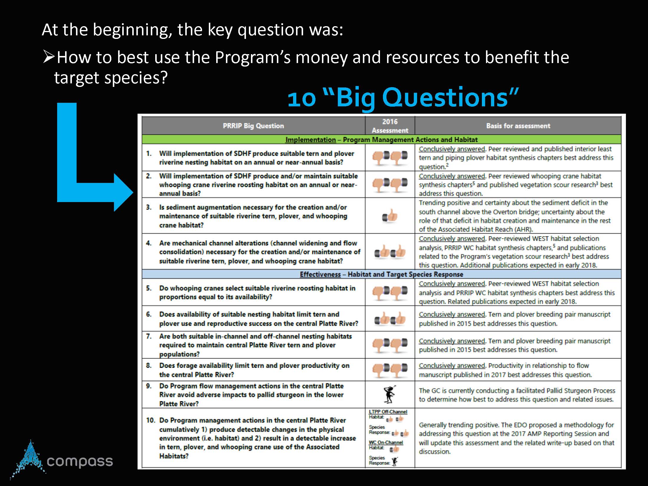 When the program began in 2007, it was really not clear how to best use the program’s resources to best benefit those target species. There were hundreds of hypotheses around how to benefit those species, so they decided to organize them into ten big questions to focus research and experiments.