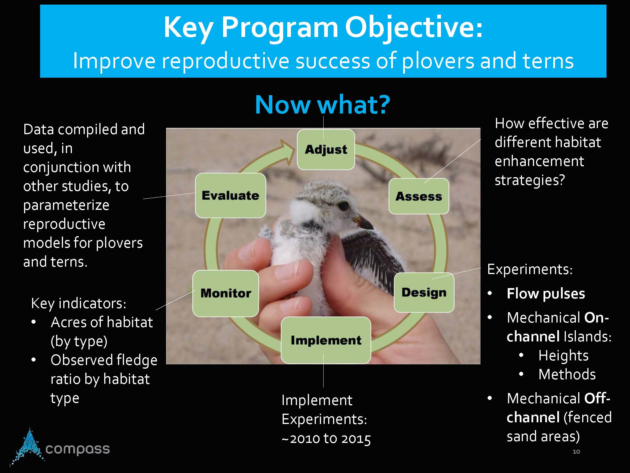 They started with a general statement of what they were trying to do which was figure out how effective are different habitat enhancement strategies for improving reproductive success of plovers and terns. She noted that there are several hypotheses and big questions associated with that. For experiments, they designed some short duration high-flow pulses and they built in-channel islands of different heights and with different methods as well as habitat off channel, which was basically fenced sand areas that could protect the birds from predators. They implemented and monitored those experiments over about six years.