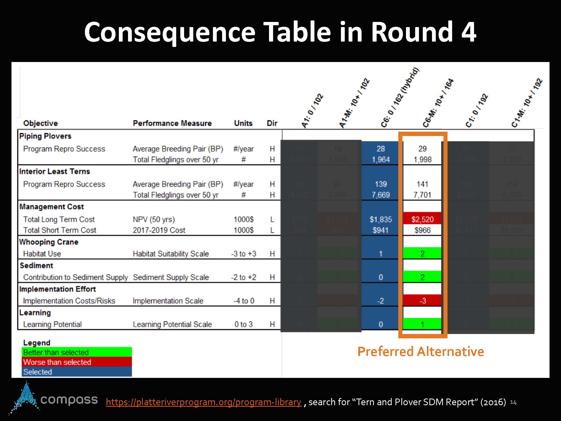 “What they wanted to do was a long-term active adaptive management program for about 15 years to sequentially test those alternatives to see if they could get better information on those effect hypotheses,” she continued. “The whole stakeholder committee was involved in deliberating and talking through this consequence table and learning about what the trade-offs were. This process did help to create buy-in for what became a 15-year plan for adaptive management to test the hypotheses of alternatives 4, 5, and 6. So in this way, this process created the space for quite a robust active adaptive management plan that is long-term and has stakeholder buy-in.”