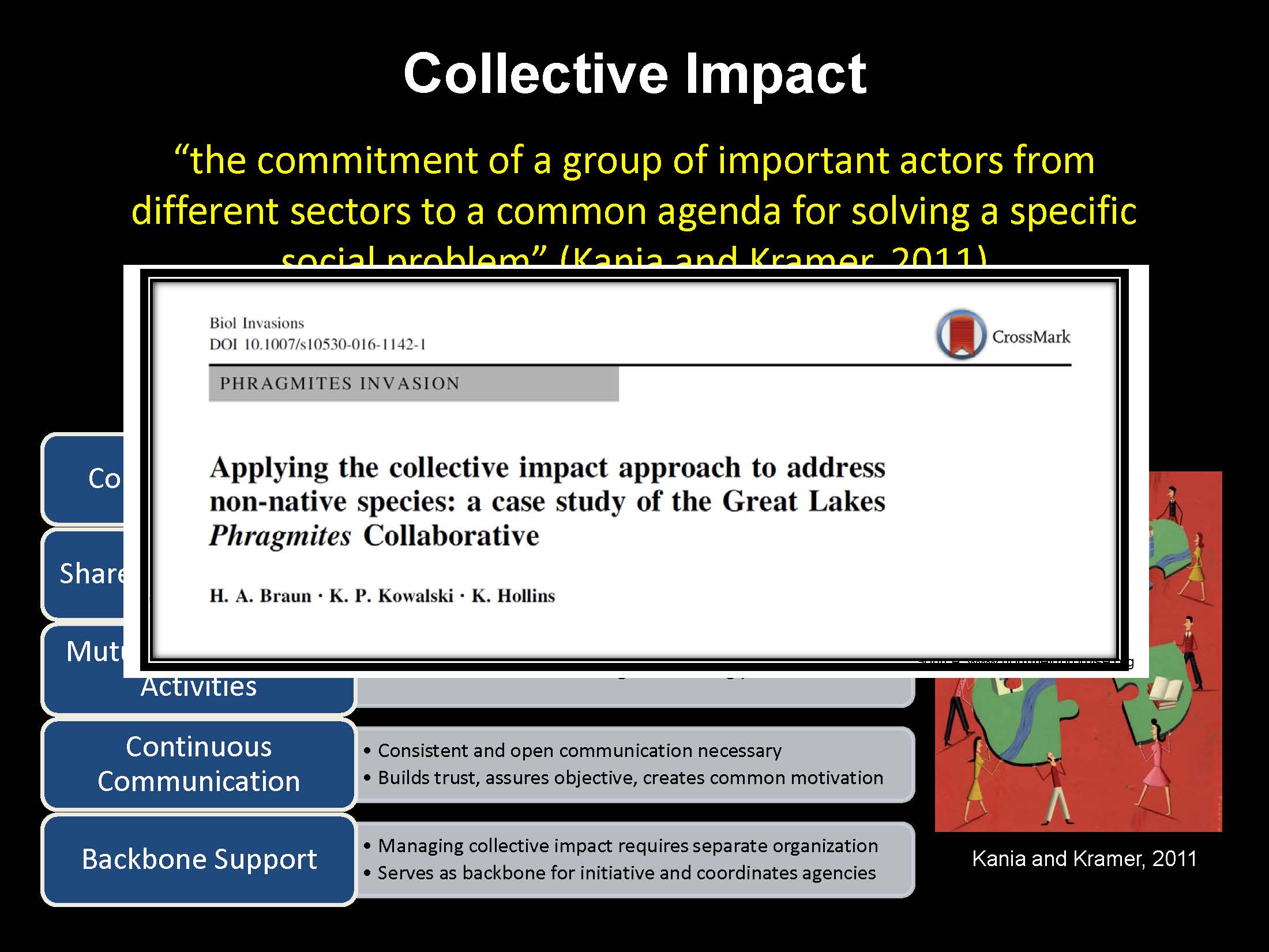 The Phragmites Collaborative is based on the idea of ‘collective impact’, which is defined as the commitment of a group of important actors from different sectors to a common agenda for solving a specific social problem. It essentially takes collaboration to a new level by setting out tenets needed in order to achieve a collective impact of an action, including a common agenda and goals, shared measurements, and accountability for achieving the conservation objectives that are being addressed. A backbone agency or entity is needed to keep driving the process forward.