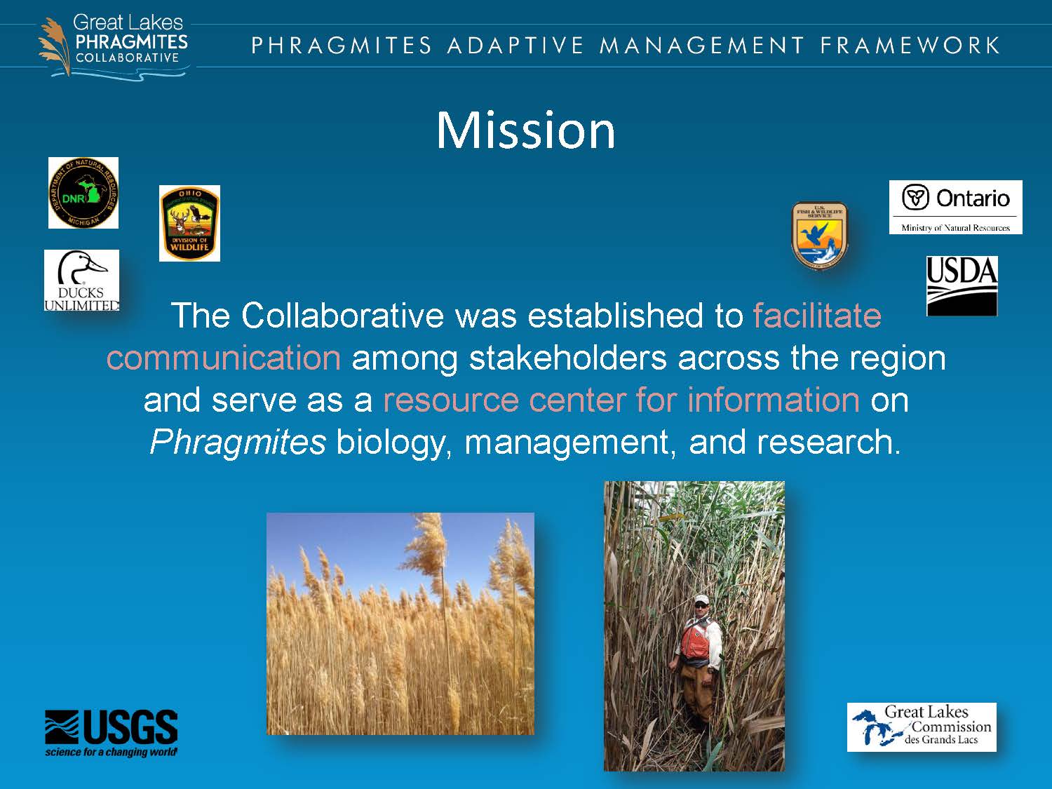 In terms of the governance structure, the Great Lakes Phragmites Collaborative has a core team that provides administrative and strategic guidance to the collaborative. There is an advisory committee comprised of volunteers from federal agencies, state agencies, provincial entities, non-profits, academia, and others representing the various interests in this issue.