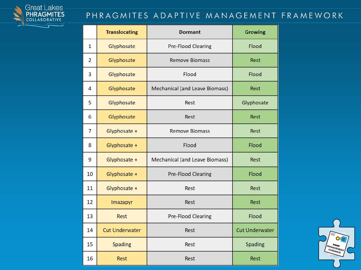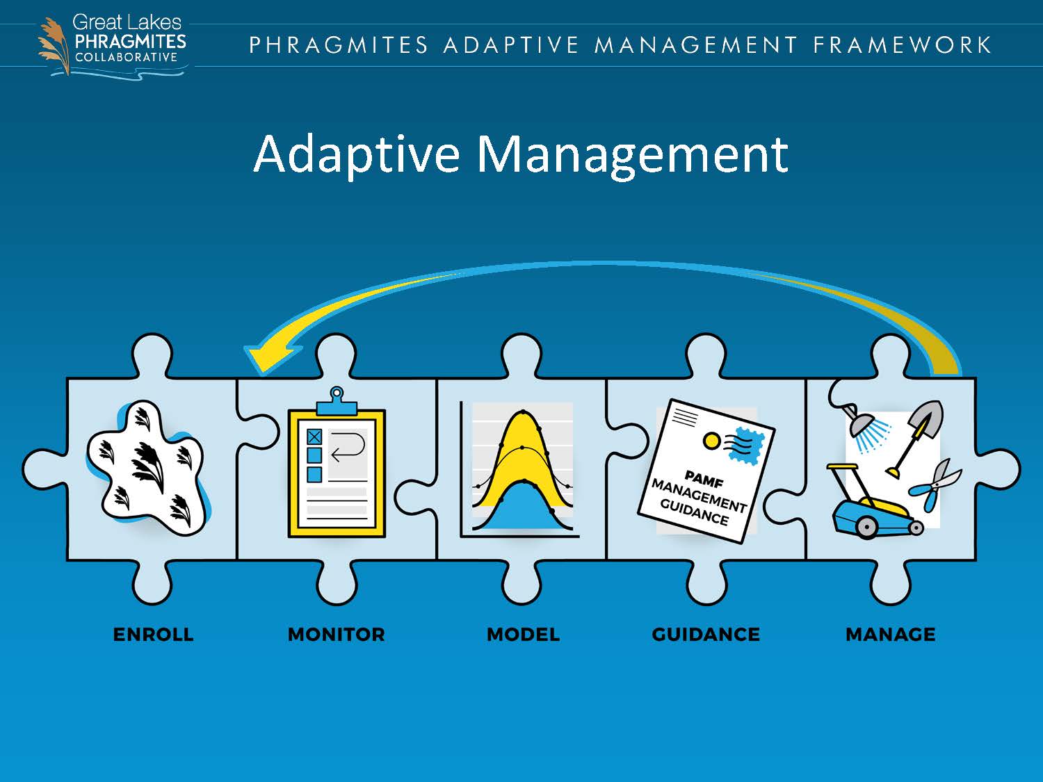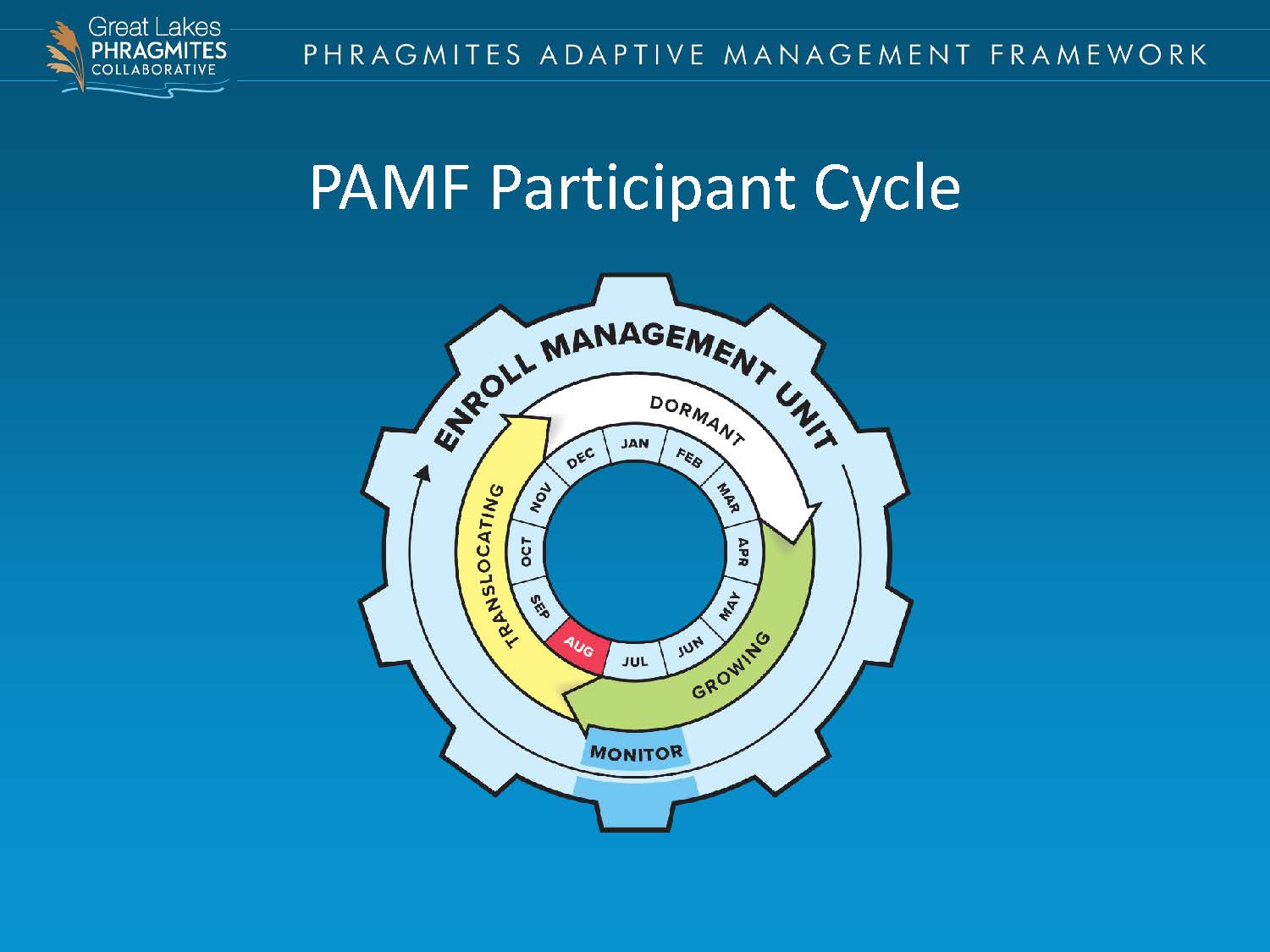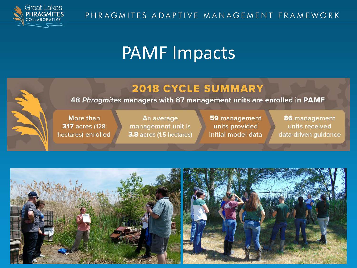 Periodically, they survey folks engaged with the collaborative to ask they feel the collaborative is on track and to see what more folks are feeling that are needed. “One of the outputs of the 2015 survey was that there’s a lot of folks that identified the need for mapping tools, scaled monitoring protocols, decision support tools, and then information about where other people are doing things,” he said. “This all fits very well within this adaptive management conceptual framework, so in 2016 is when we really initiated the set up phase which we called the Phragmites Adaptive Management Framework or PAMF. PAMF is a participant-driven adaptive management program, providing management guidance to managers on the ground with the goal of establishing an effective and efficient management that’s based on data and on science.”
