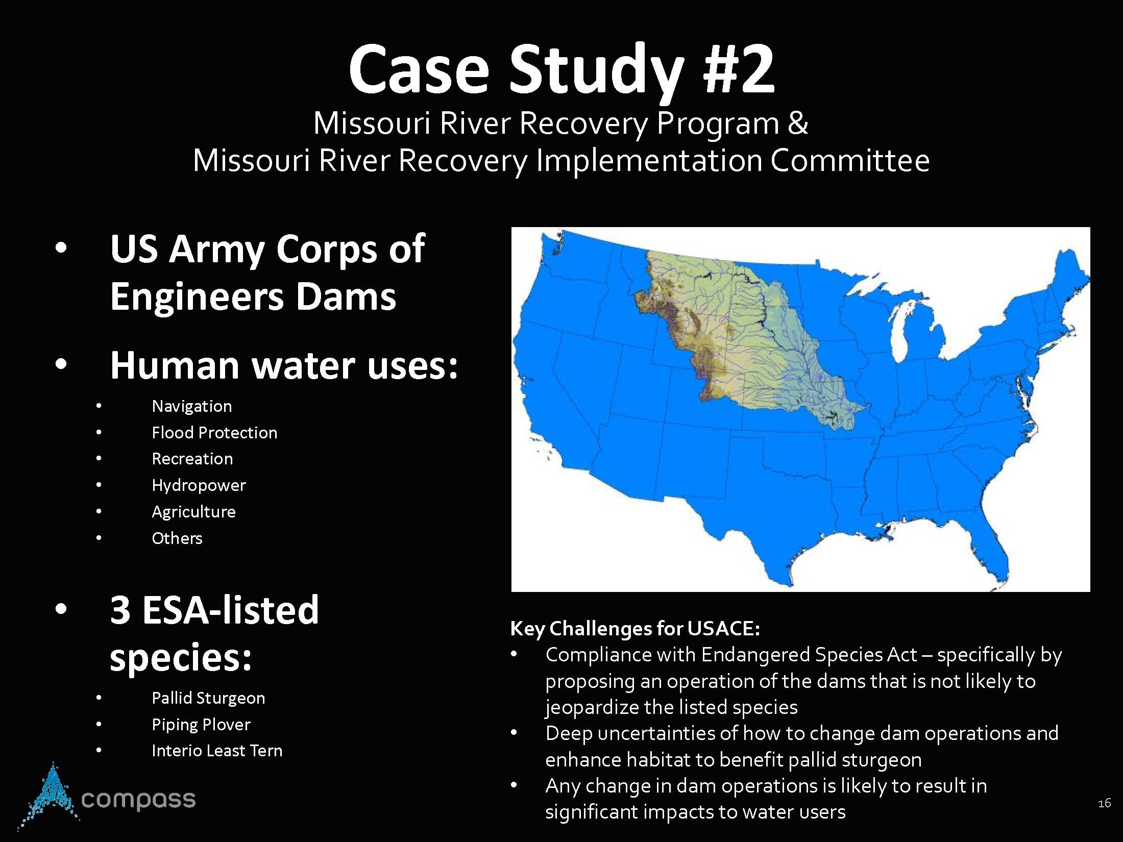 Since 2000, the US Army Corps has been challenged to come up with a way to avoid a determination of jeopardy by the US FWS for pallid sturgeon, which had become a listed species. The challenge was that there are deep uncertainties of how to change dam operations to enhance habitat for pallid sturgeon, and any change in the dam operations is likely to result in significant impacts across all of the human water users.