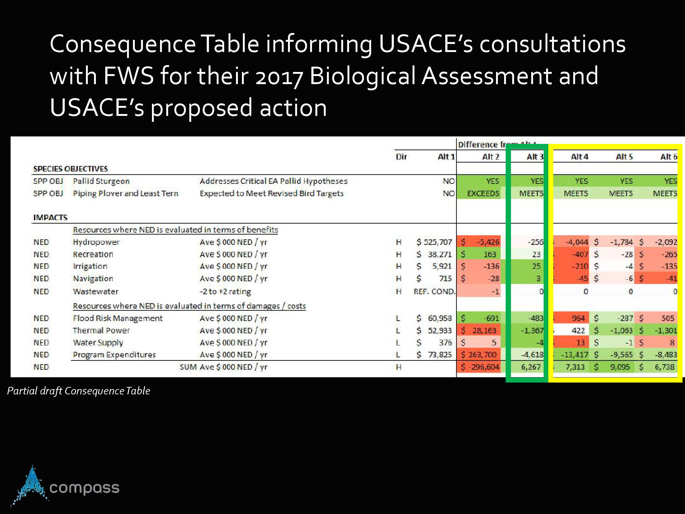 Compass has been working with them since about 2014 as a structured decision making advisor. Ms. Rudd shared one aspect of the work that was used to inform the development of a proposed action in the Army Corps 2017 biological assessment. The Fish and Wildlife Service accepted that proposed action and in 2018, the Army Corps received a no jeopardy determination from the FWS which was their objective since 2000.
