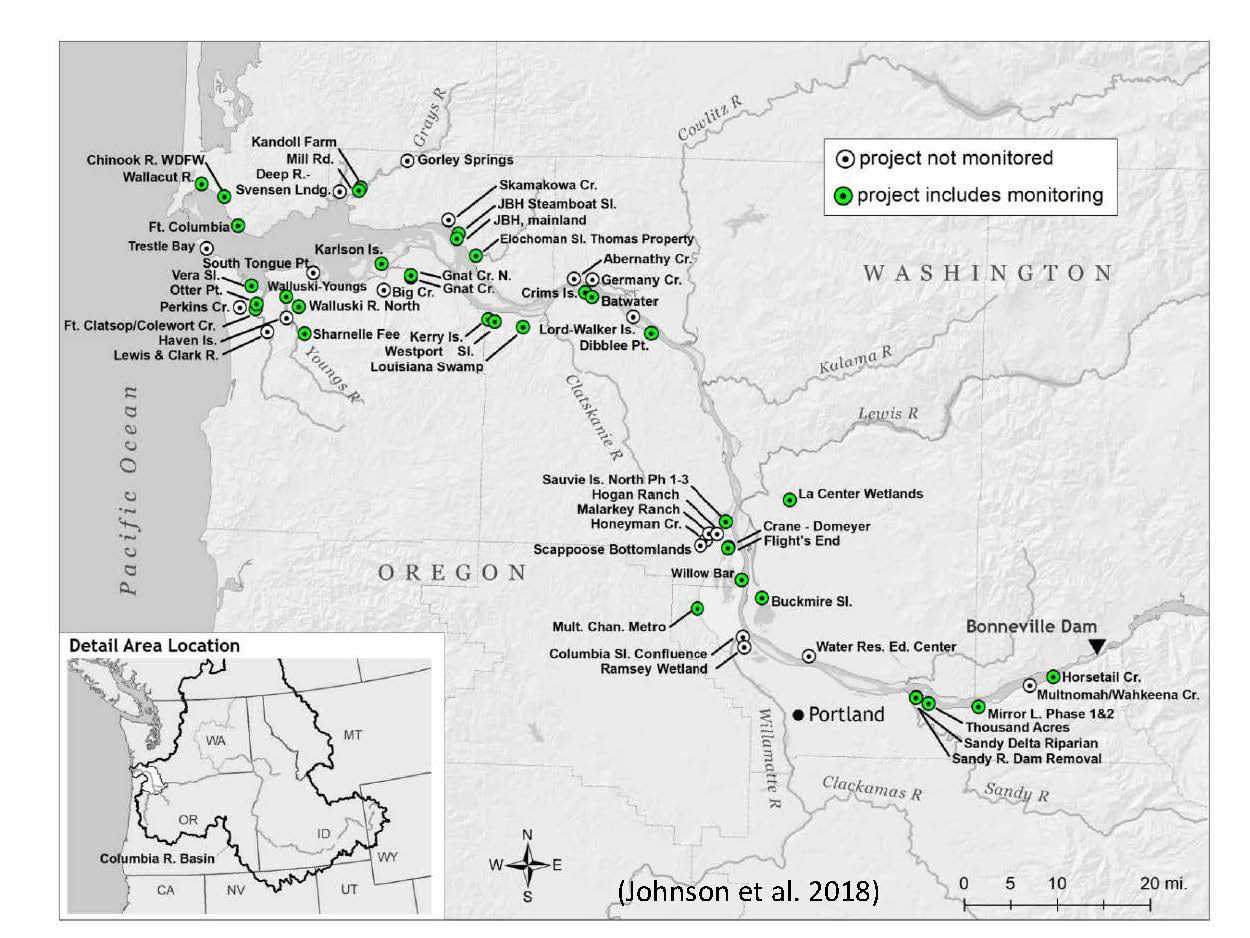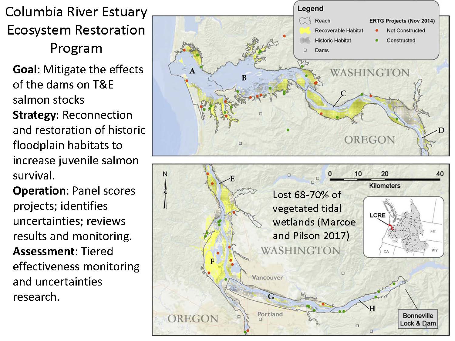 The goal of the Columbia River Estuary Ecosystem Restoration Program is to mitigate the effects of the dams on threatened and endangered salmonids by reconnecting and restoring the historic floodplain habitats to defragment the system. The program’s operations involves a panel that scores projects that are brought to it, identifies uncertainties, and reviews results of monitoring and assessments.