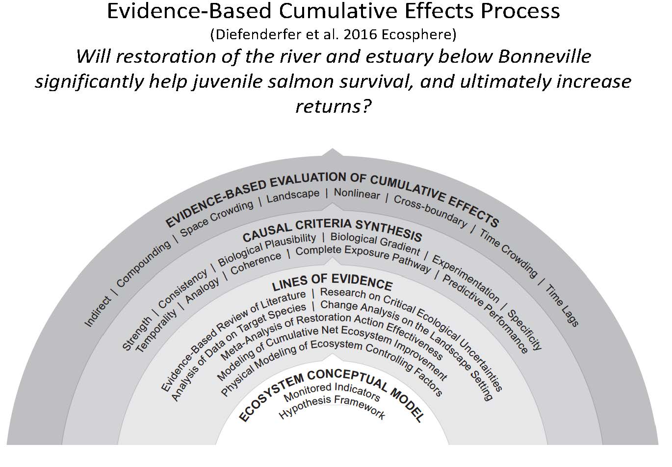 The Evidence-Based Cumulative Effects Process study tried to answer the question, will restoration of the river and estuary below Bonneville significantly help juvenile salmon survival, and ultimately increase returns? Dr. Thom said this study was the hardest thing he’s ever been involved with in his entire career; it took six years, a lot of field work, analysis, and modeling, and working with a lot of smart people.
