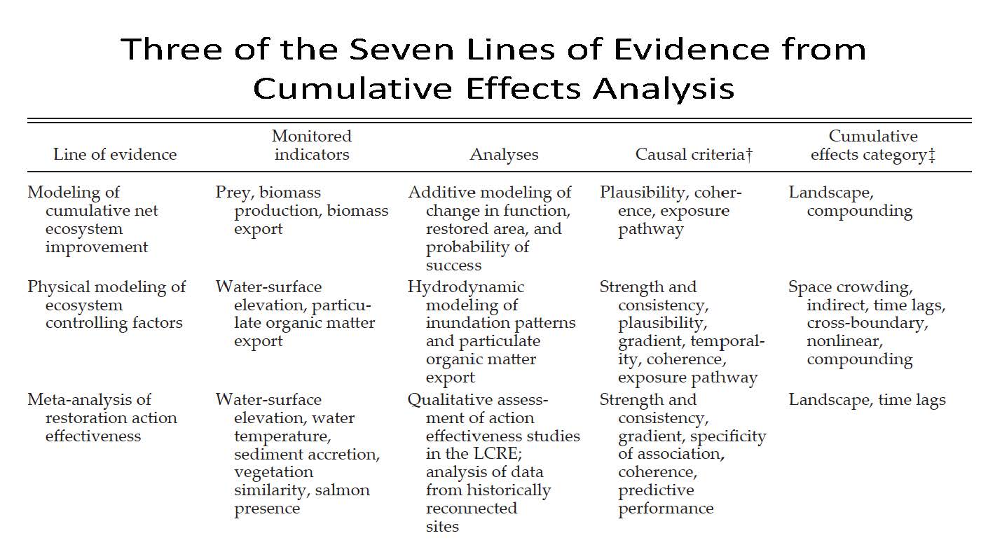 Dr. Thom then presented one of the tables from the paper showing three of the seven lines of evidence. “One of the lines of evidence is called cumulative net ecosystem improvement,” he said. “That means what area did you restore, what function over that area, and what was the probability of it working? You can multiply that, you get a number of these, and you can start getting a cumulative effect of marsh macrodetritus biomass being exported to the estuary, for example. And there’s ways you can evaluate in term of plausibility, coherence, exposure pathway, and landscape and compounding factors that indicate cumulative effects.”