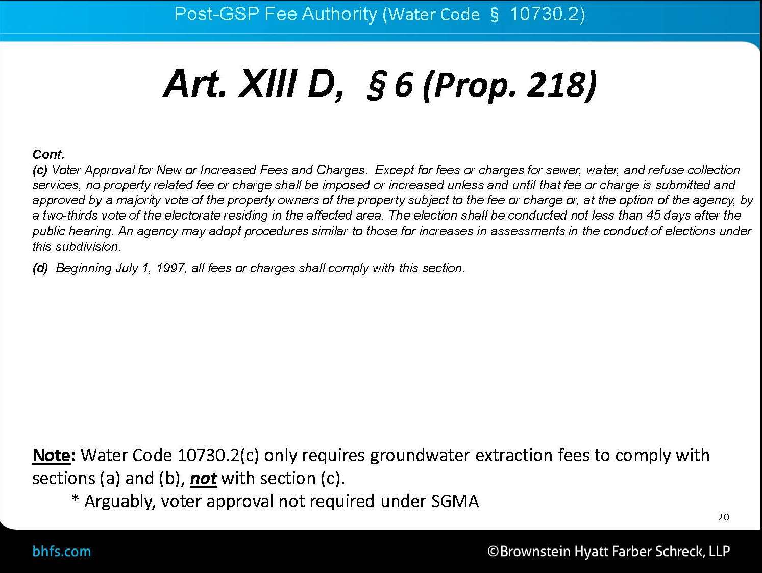 Post-GSP fees are also explicitly required to comply with the substantive and procedural requirements of Prop 218. However, Ms. Acos noted that Water Code section 10730.2, subsection C only requires groundwater extraction fees to comply sections A and B of Prop 218, and not with section C of Prop 218.