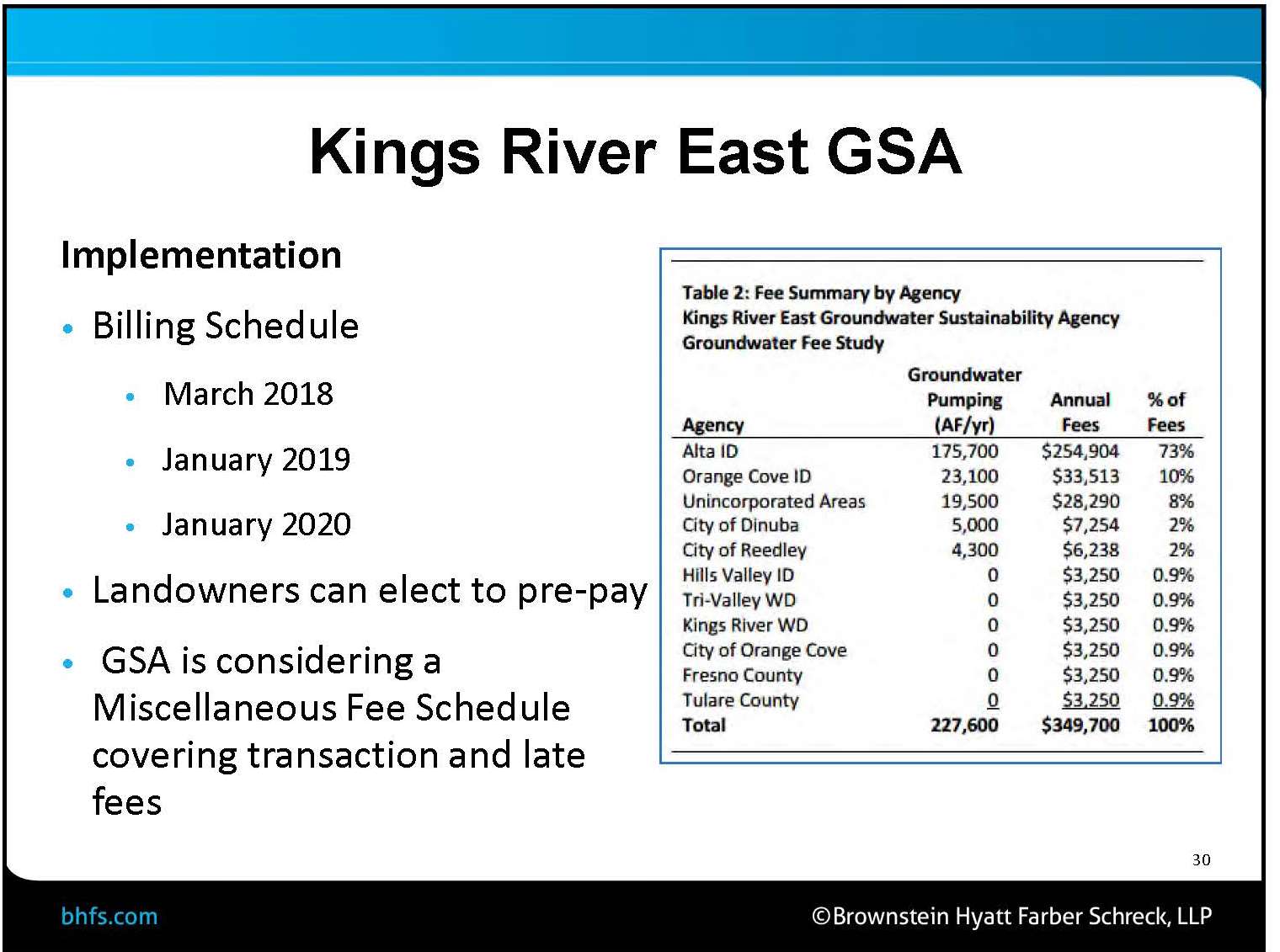 He also noted that with the South Fork Kings GSA, the City of Lemoore has incorporated the fees into their rate structure, so the city pays the fees for everyone in its service area, and the ratepayers reimburse the city for the fees.