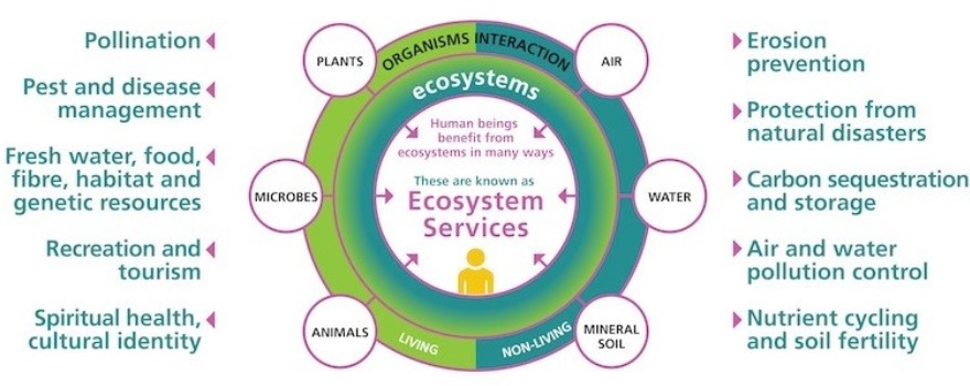 Ecosystems are the communities that are formed by the interaction between living things such as plants, wildlife, and humans, and non-living things, such as the air, water, and soil. Humans are both part of ecosystems and a beneficiary of ecosystems in many ways; those benefits are known as ecosystem services.