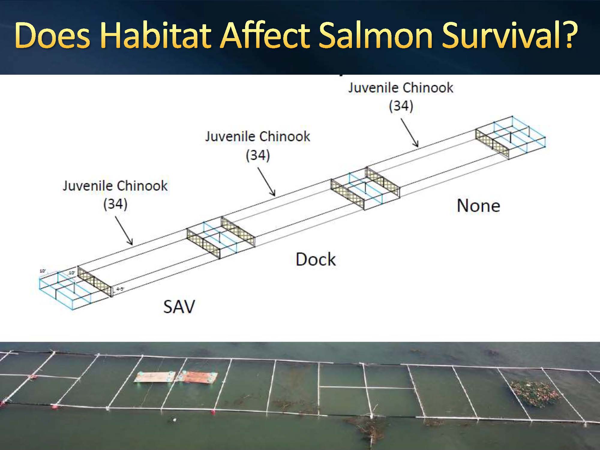 To answer the question does habitat affect salmon survival, for this experiment the number of predators was the same in each enclosure, so they were only manipulating the habitat. The three habitats they used for the study were submerged aquatic vegetation or SAV, a simulated dock habitat, and a no-habitat treatment.