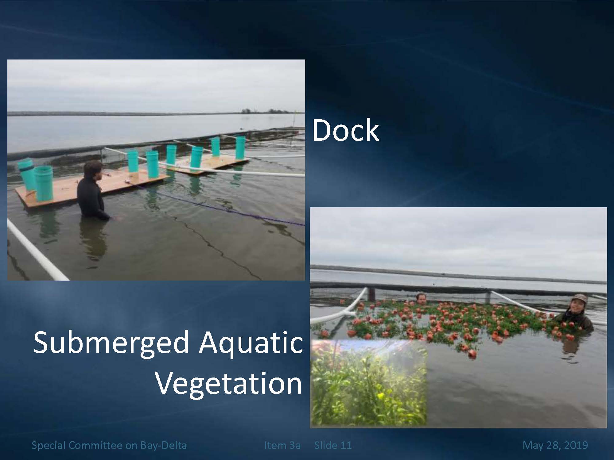 Ms. Collins noted that there is a lot of submerged aquatic vegetation in the Delta. She presented a slide showing submerged aquatic vegetation in Franks Tract in the years 2004, 2015, and 2018.
